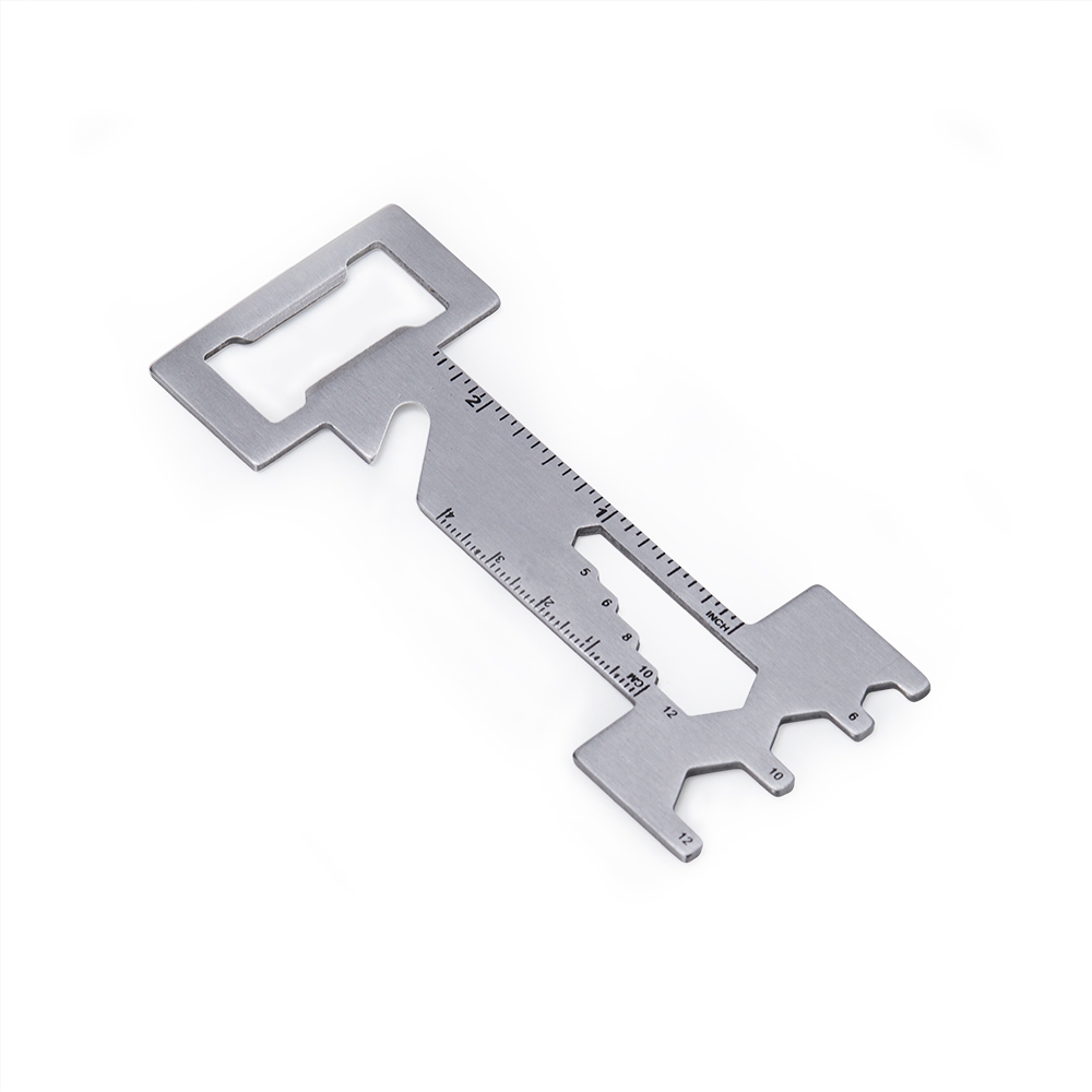 Descrição: Abridor de garrafas metálico multiferramentas, possui réguas com unidades em centímetros e polegadas, 5 chaves de boca, 3 chaves hexagonais e faca de cordão.