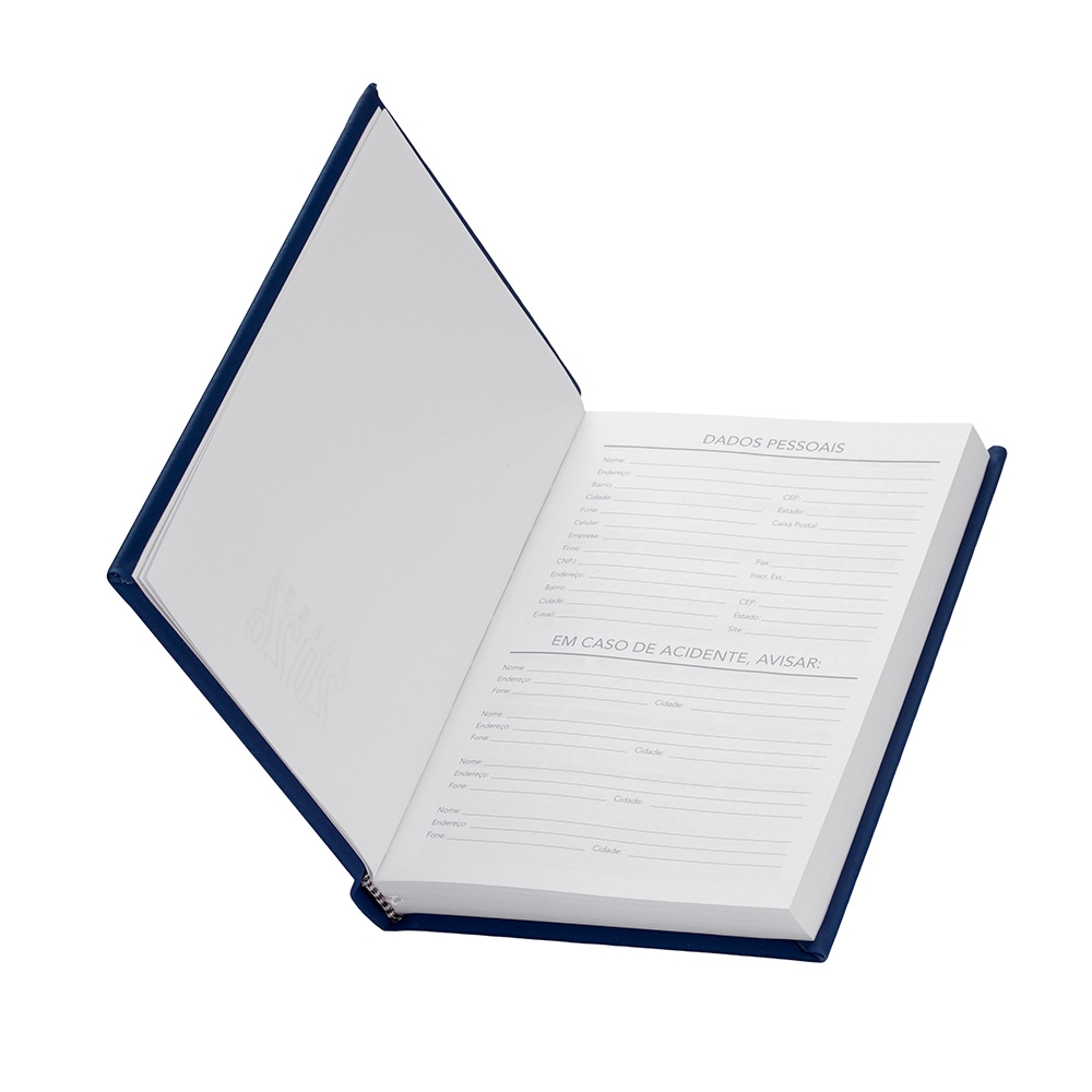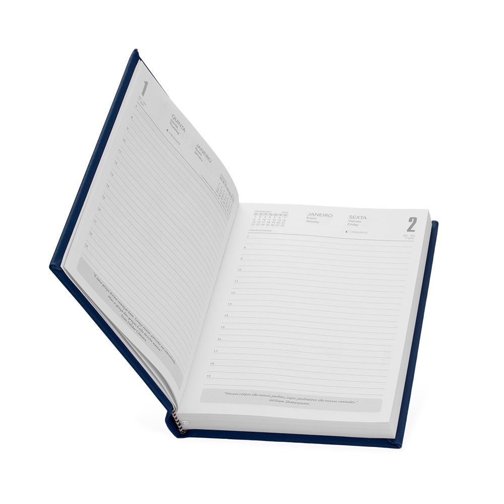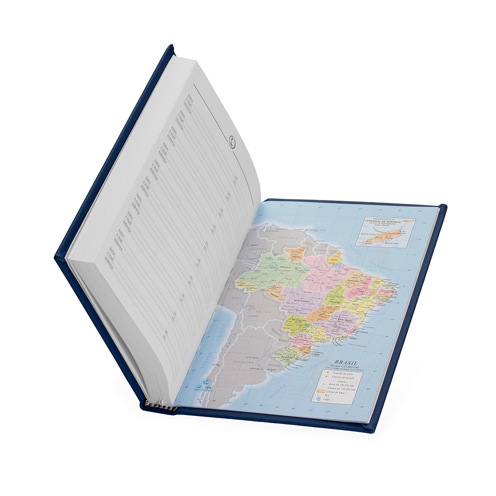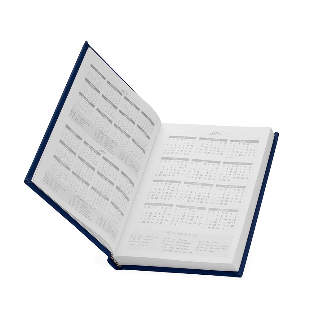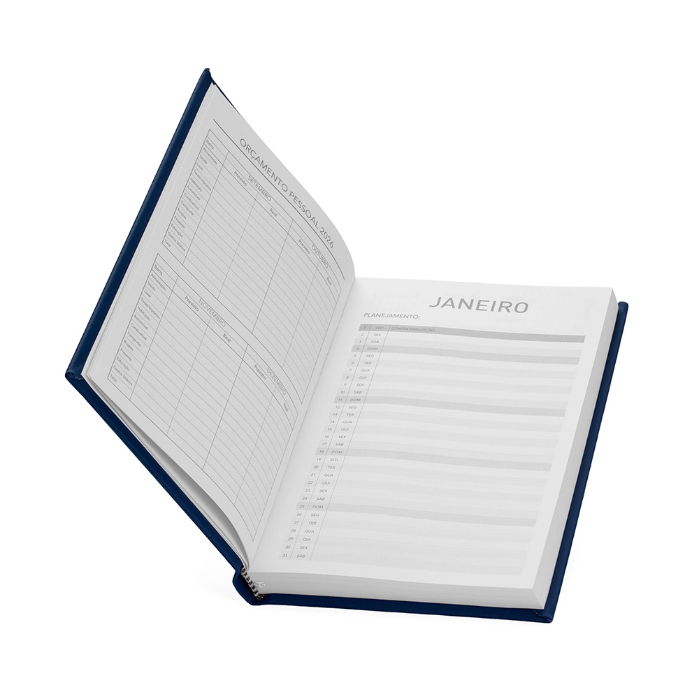 Descrição: Agenda 2026 com capa dura de revestimento emborrachado. Contém páginas dedicadas para dados pessoais, calendários de 2025 até 2027, orçamentos mensais, anotações, planejamentos mensais, lista de contatos e mapas.
