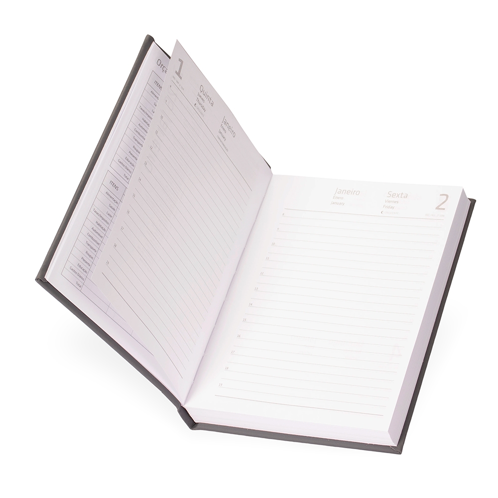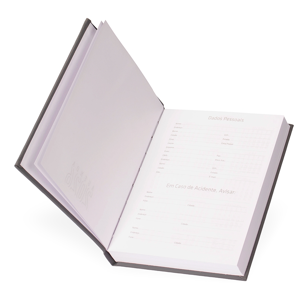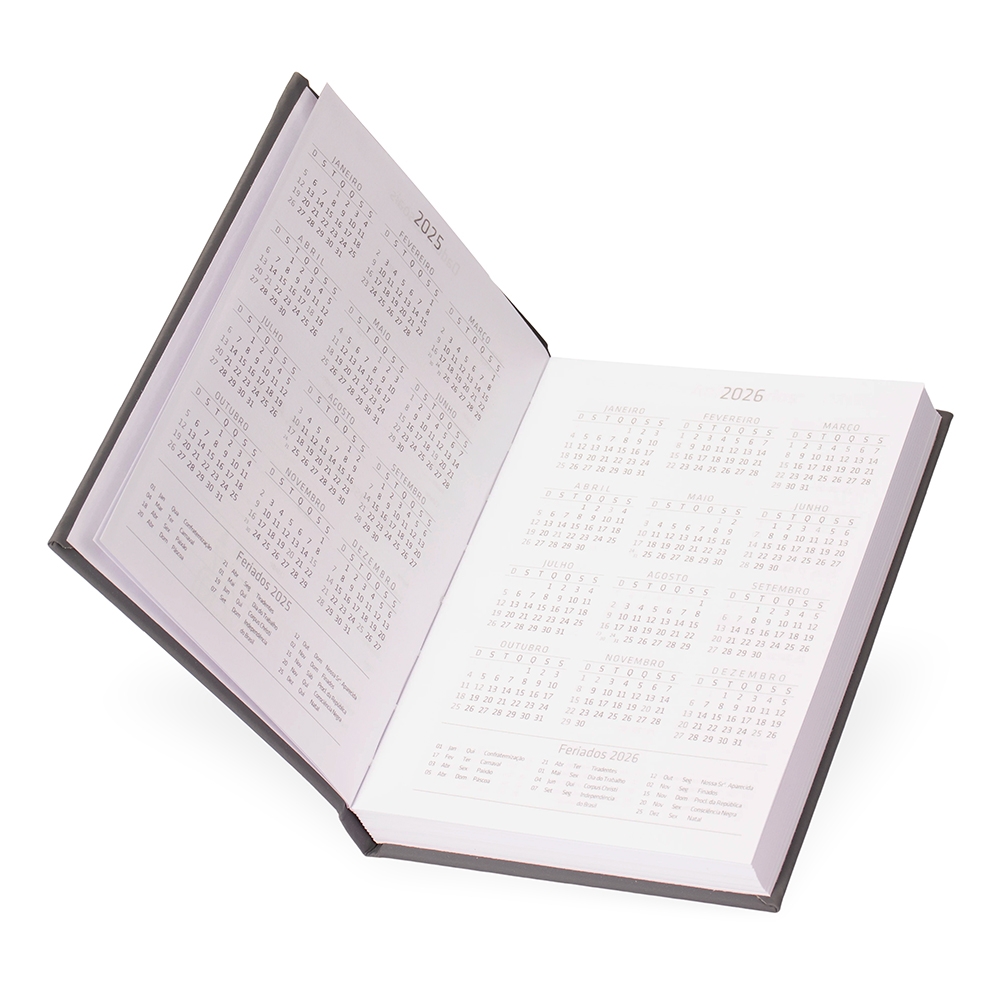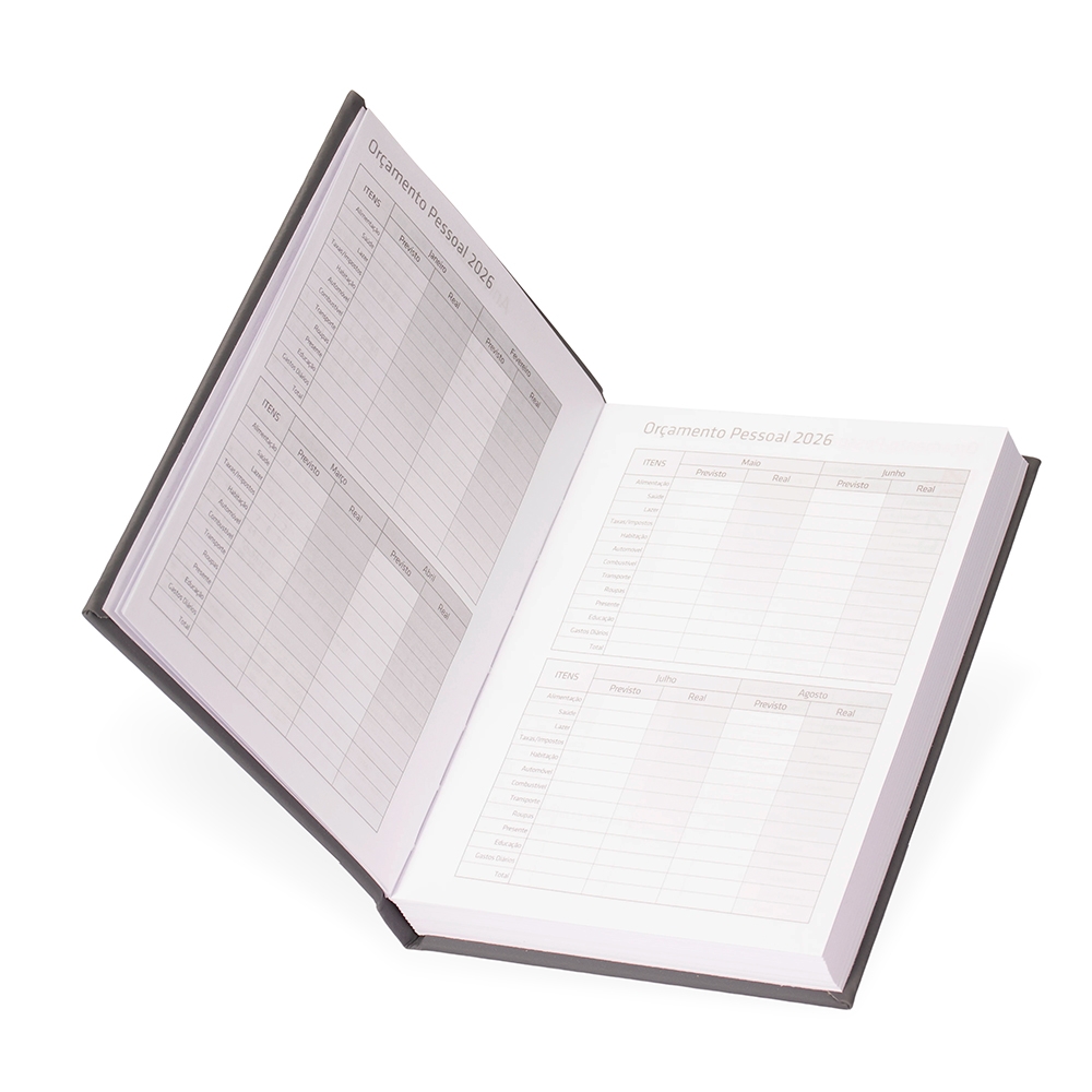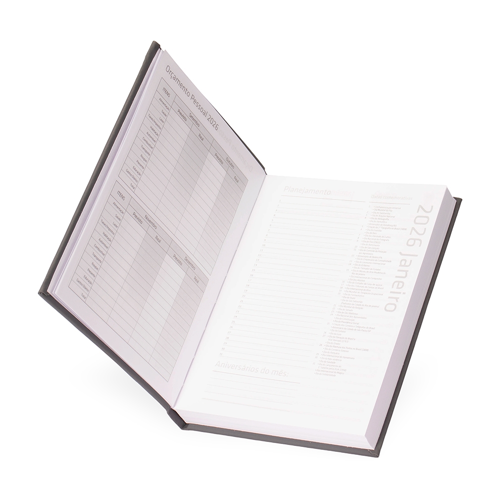 Descrição: Agenda 2026 com capa emborrachada. Conta com páginas dedicadas para dados pessoais, calendários de 2025 a 2027, orçamento pessoal, planejamento mensal, espaço para anotações diárias e lista de contatos e aniversários.