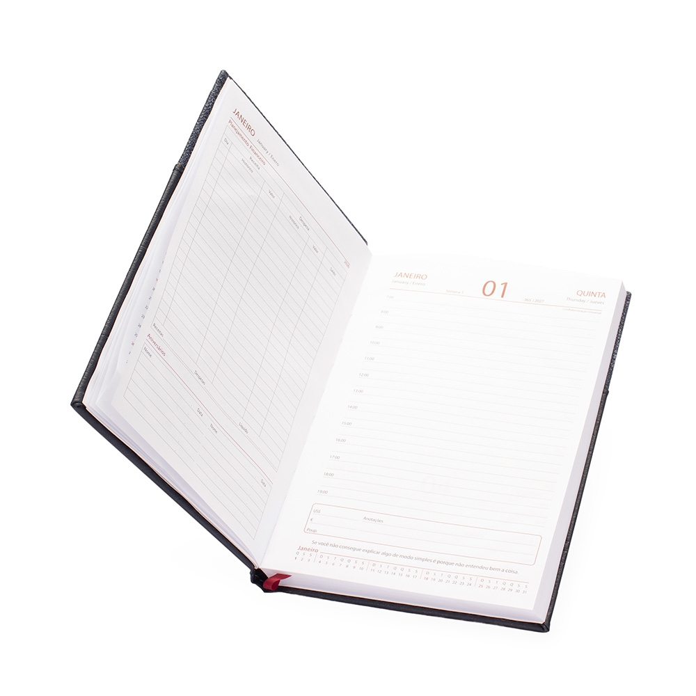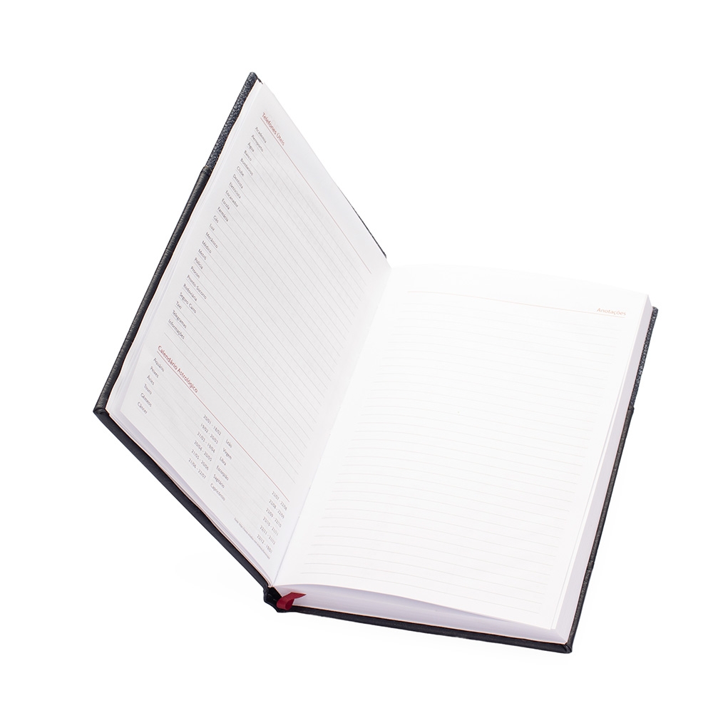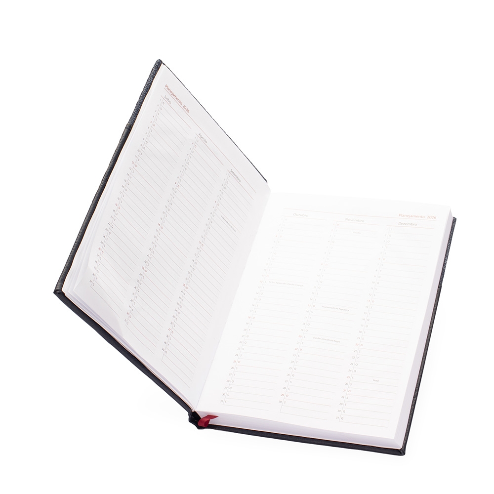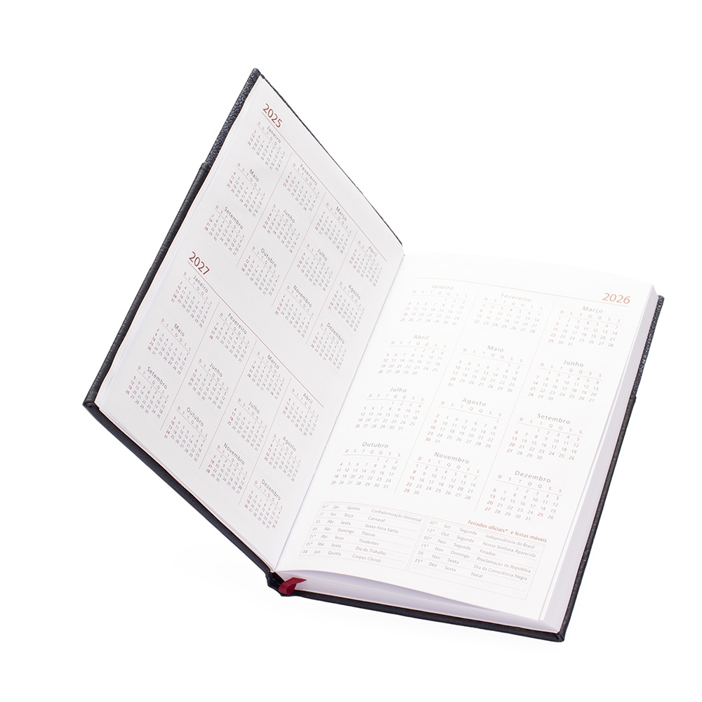 Descrição: Agenda 2026 com capa dura em poliuretano (PU) e marcador de páginas em cetim. Possui páginas dedicadas a dados pessoais, calendários de 2026 a 2028, lista de contatos e itens de conversão de unidades de medidas, códigos DDD e DDI e mapas.