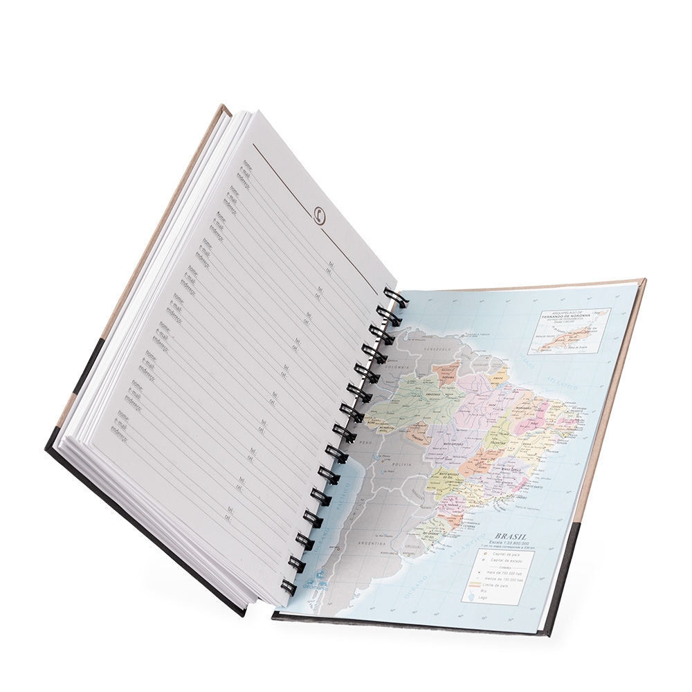 Descrição: Agenda diária modelo 2026 com capa dura em kraft e encadernação em Wire-O. Contém páginas dedicadas a dados pessoais, calendários de 2025 a 2027, orçamento pessoal, planejamento mensal, espaço para anotações, lista de contatos e mapas.