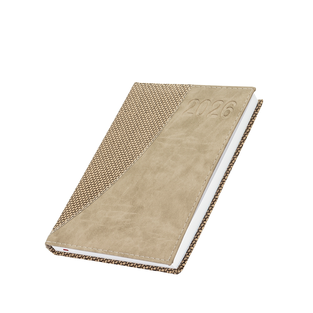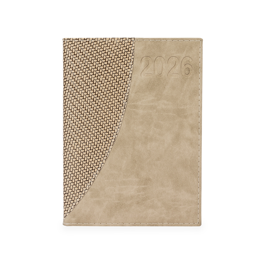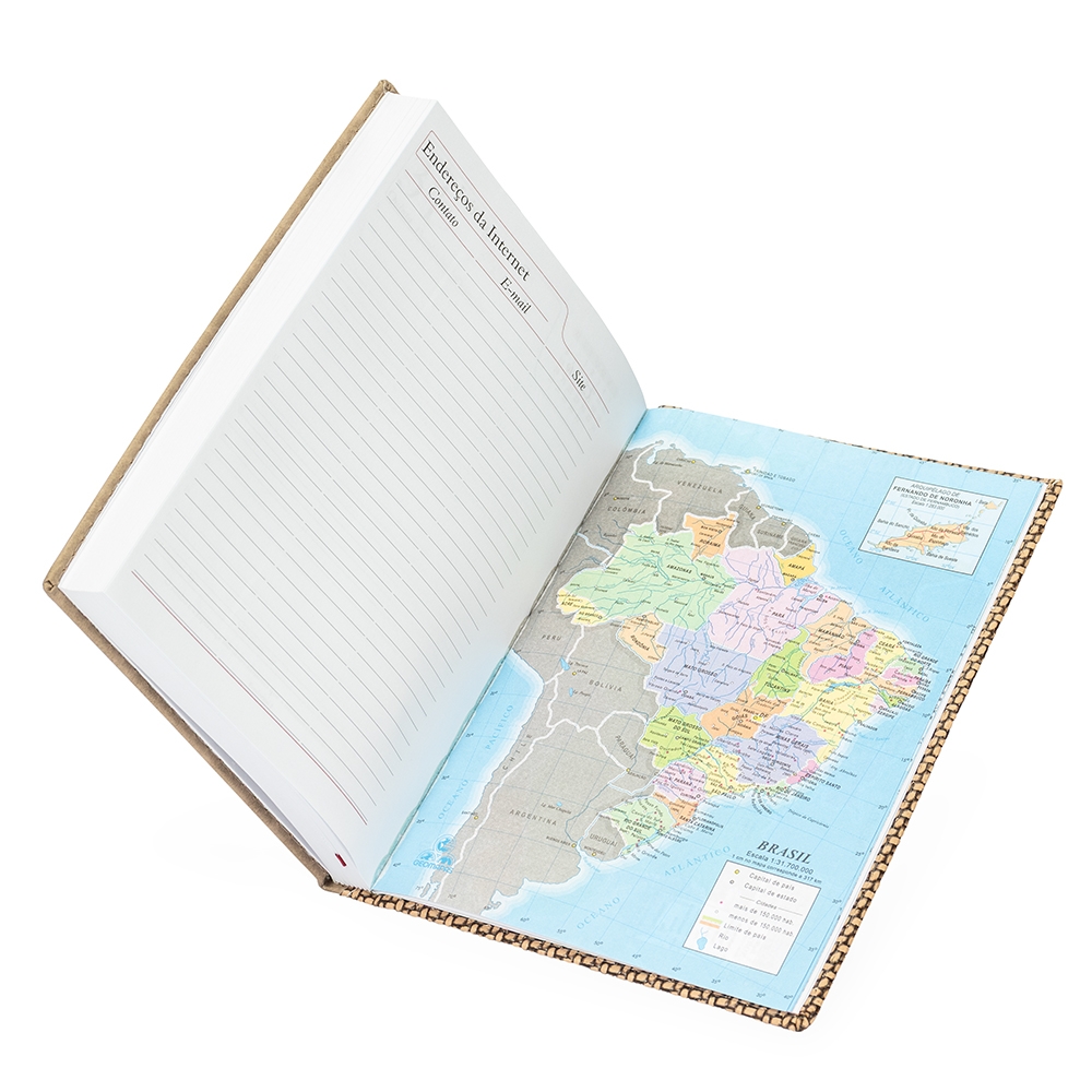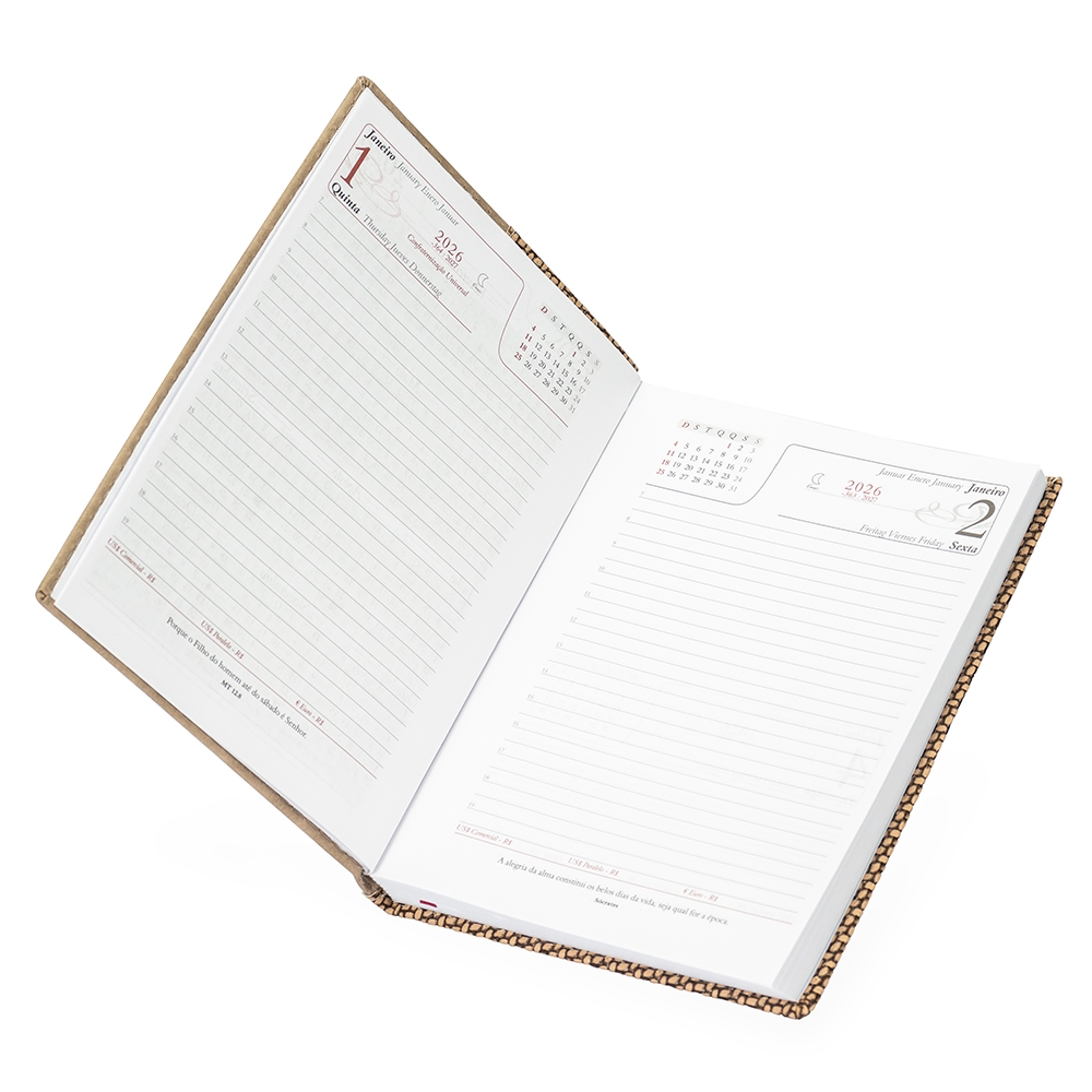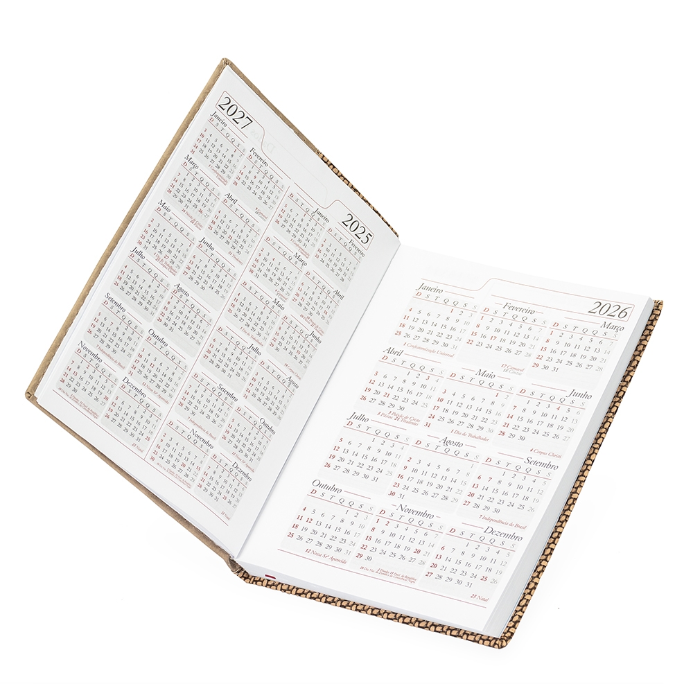 Descrição: Agenda diária 2026 em couro sintético com detalhes texturizados e marca-páginas em fita de cetim. Contém páginas dedicadas a dados pessoais, calendários de 2025 a 2027, lista de contatos, planejamento diário e mapas.