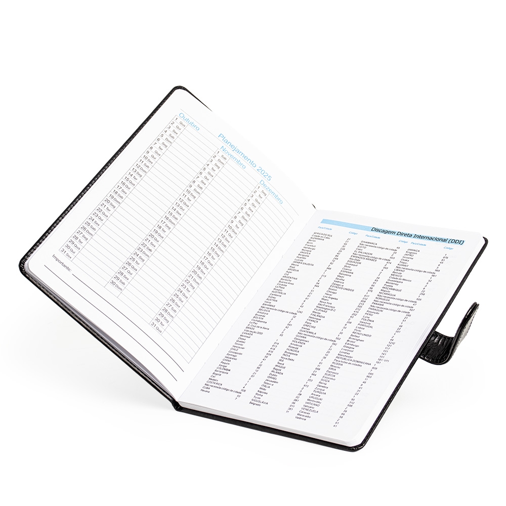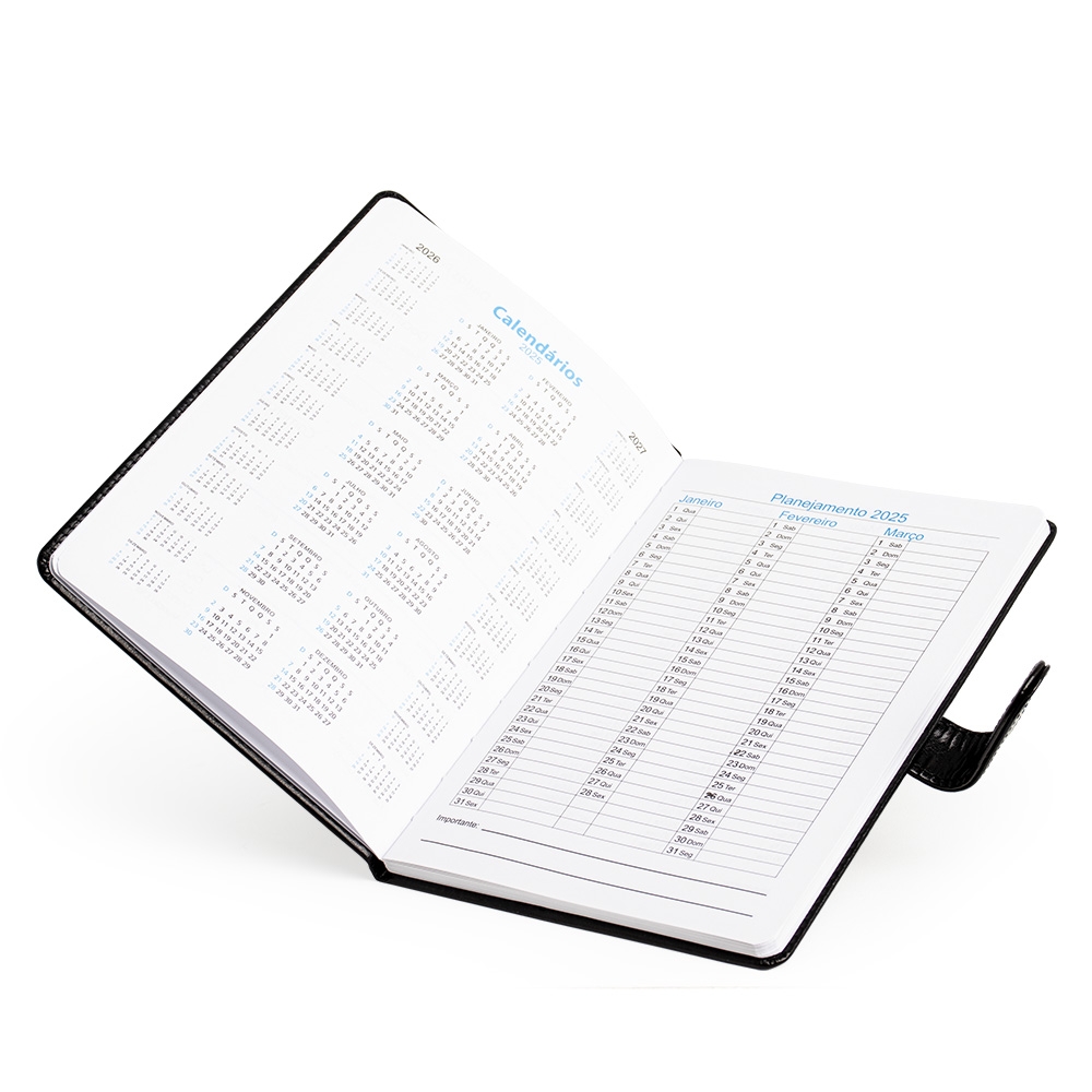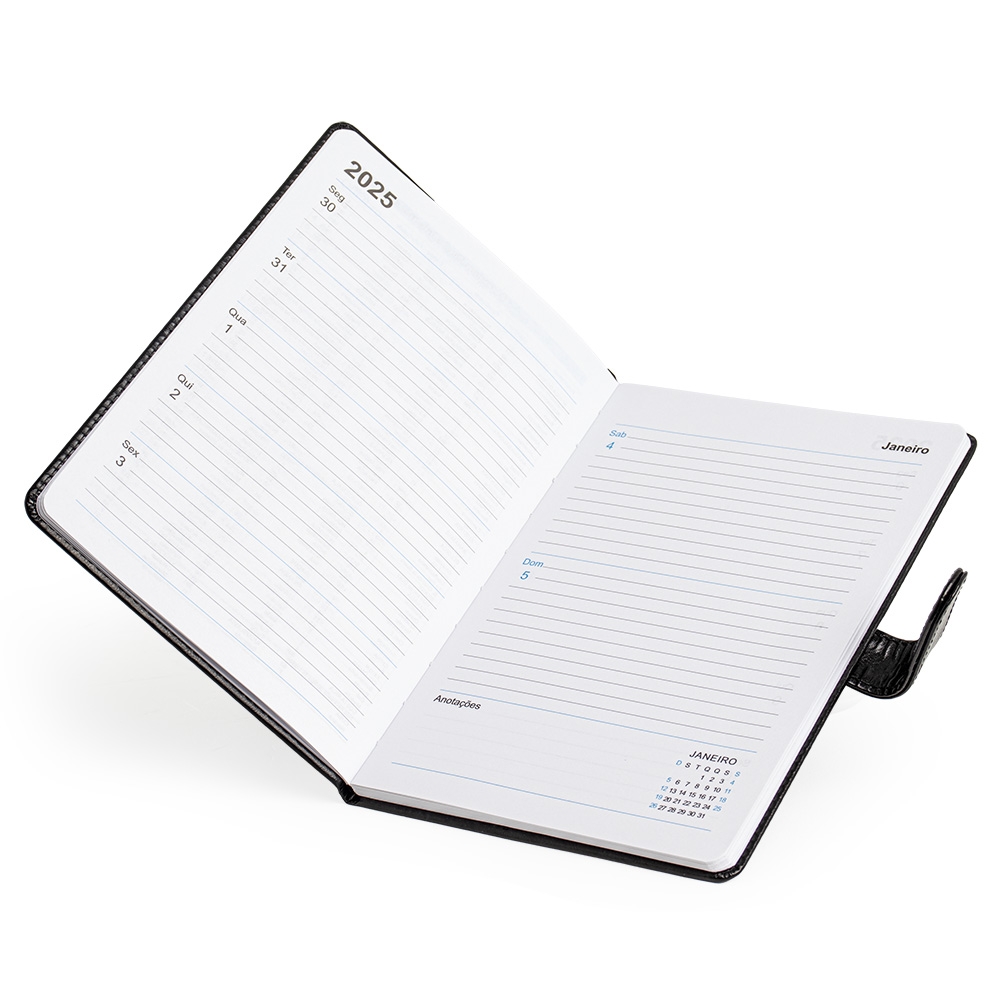Descrição: Agenda semanal 2025 produzida em couro PU com fecho magnético. Contém folhas para dados pessoais, calendários 2025 à 2027 e planejamento 2025.