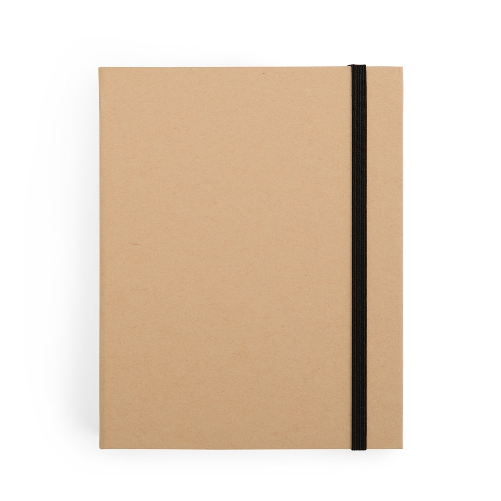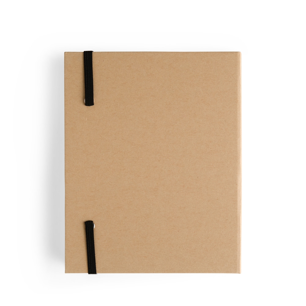 Descrição: Bloco de anotações com capa dura em kraft e fechamento por elástico. Possui aproximadamente 80 folhas de tonalidade marfim sem pautas e cinco canetas coloridas de ponta dupla: uma fina e outra tipo pincel.