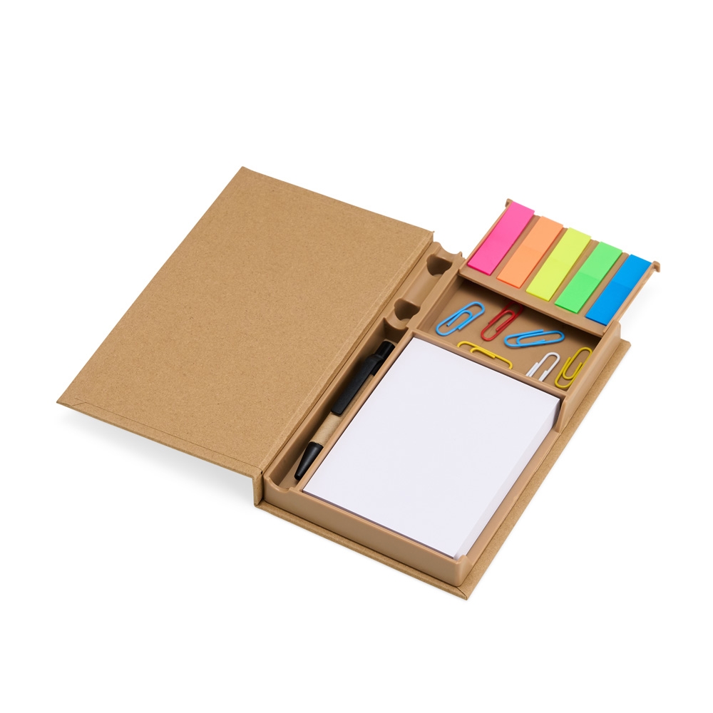 Descrição: Tudo em seu lugar, prontinho para as anotações! Nosso Bloco de Anotações Ecológico é perfeito para manter a organização enquanto se registra ideias. Feito de material kraft, ele vem com 100 folhas brancas para anotações, 5 marcadores autoadesivos coloridos para destacar o que é importante, 7 clips guardados em uma gavetinha prática e uma mini caneta de papelão com carga esferográfica azul. E ainda conta com espaço para armazenar a caneta e dois suportes porta-caneta, garantindo praticidade no dia a dia. Este bloco é tudo o que o seu cliente precisa para dias repletos de anotações.