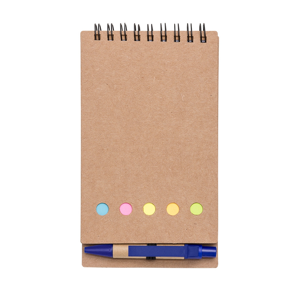 Descrição: Bloco de anotações ecológico com autoadesivos e mini caneta. Bloco com wire-o e detalhes vazados na capa, contém conjunto de cinco bloquinhos autoadesivos coloridos, bloco autoadesivo pequeno, miolo com folhas pautadas e suporte de nylon com mini caneta de papelão com carga esferográfica na cor azul e acionamento por clique..