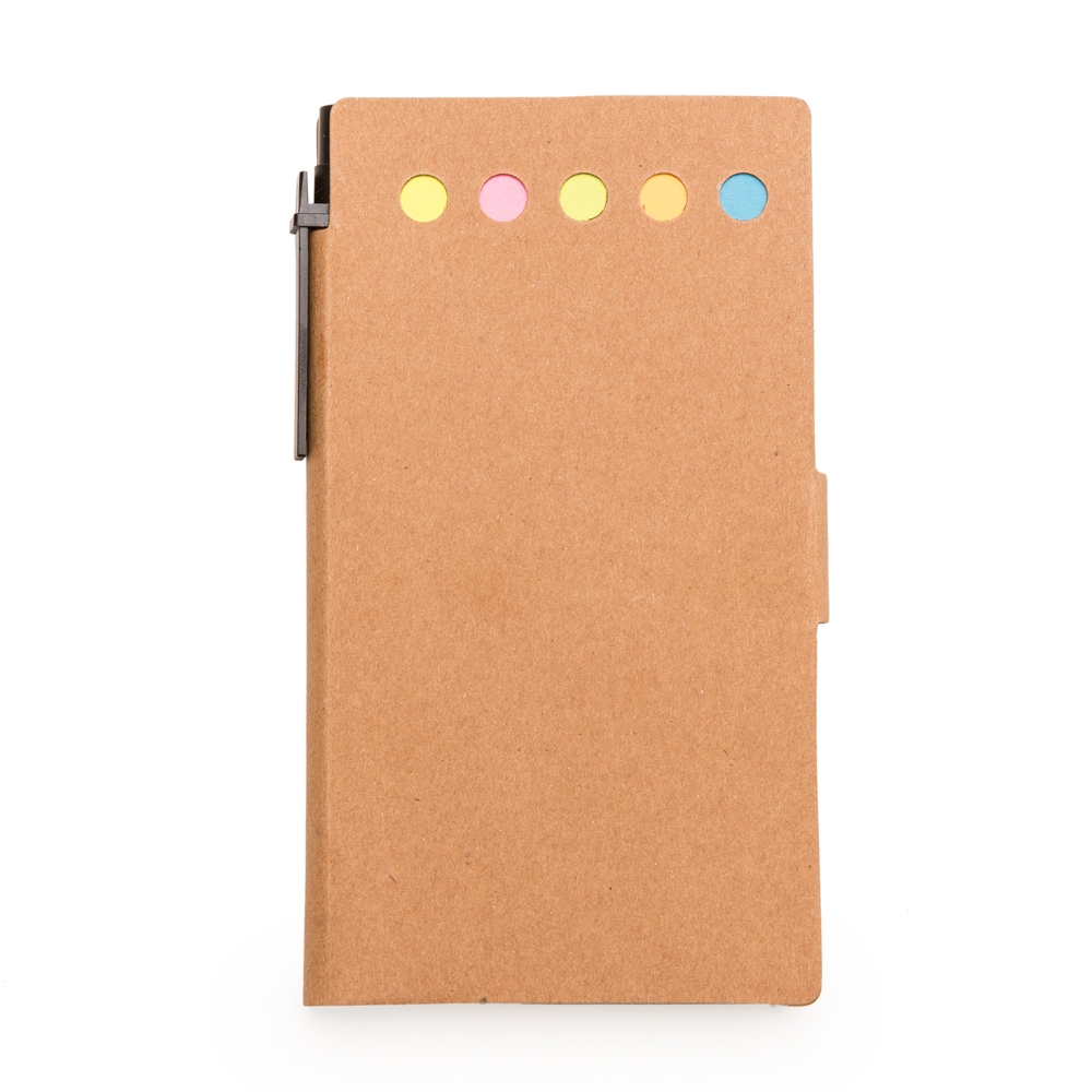 Descrição: Bloco de anotações ecológico com caneta reciclada. Possui uma trava na própria capa, caneta de papelão com acabamentos em plástico acionada por clique, cinco blocos autoadesivos coloridos com aproximadamente 20 folhas cada, bloco de autoadesivo amarelo com aproximadamente 20 folhas e bloco com aproximadamente 50 folhas brancas sem pauta.