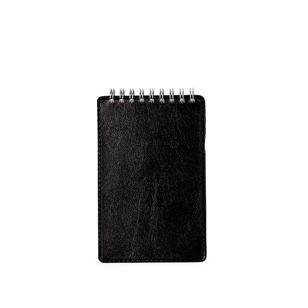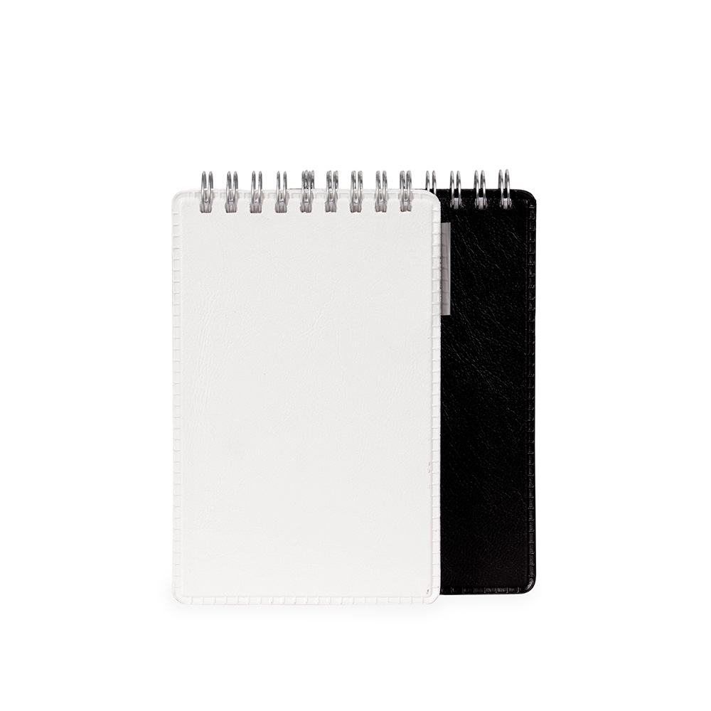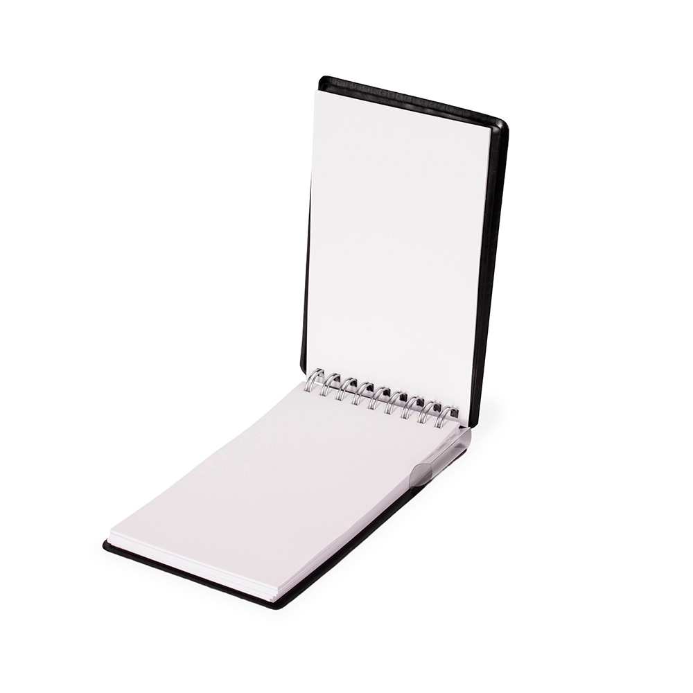 Descrição: Bloco de anotações com capa em couro sintético, porta-canetas em plástico e encadernação Wire-O. Contém aproximadamente 100 folhas brancas sem pauta.