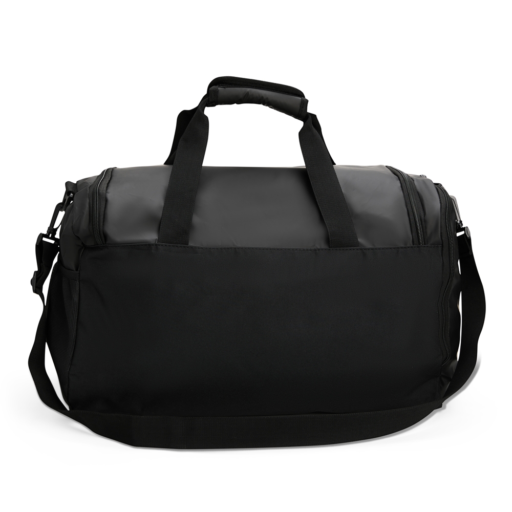 Descrição: Bolsa em couro sintético impermeável, com detalhes em malha e capacidade de até 36 litros. Apresenta três compartimentos em diferentes tamanhos, incluindo espaço tênis, além de bolso lateral em tela de nylon com elástico. Possui duas alças de mão com suporte de velcro e alça transversal.