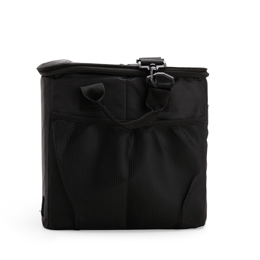 Descrição: Bolsa térmica confeccionada em poliéster 840D resistente à água e capacidade de até 33 litros. Possui revestimento térmico interno em PEVA atóxico, estrutura dobrável reforçada e tampa rígida em plástico PP com espaço para copos e abertura com fechamento em velcro. Conta ainda com três bolsos externos: um frontal com fechamento em velcro e dois laterais em tela de nylon com elástico. Acompanha alça transversal ajustável com apoio para ombro.