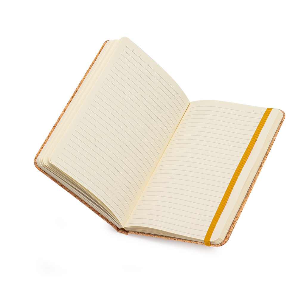 Descrição: Caderneta em papel couche 150g, contém aproximadamente 72 folhas amarelas com pauta e 16 folhas sem pauta, marcador de página em cetim, elástico para lacre e compartimento em papel para documentos ou anotações.