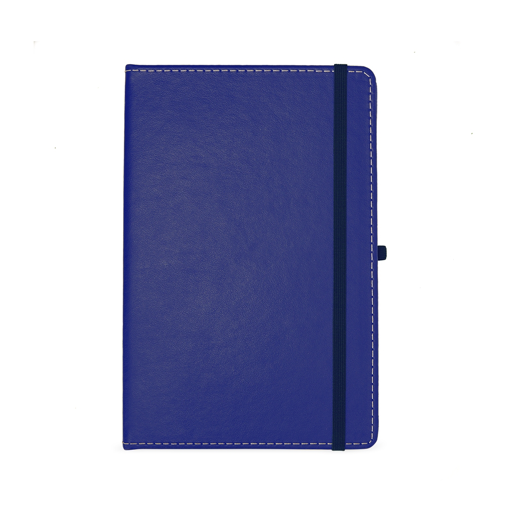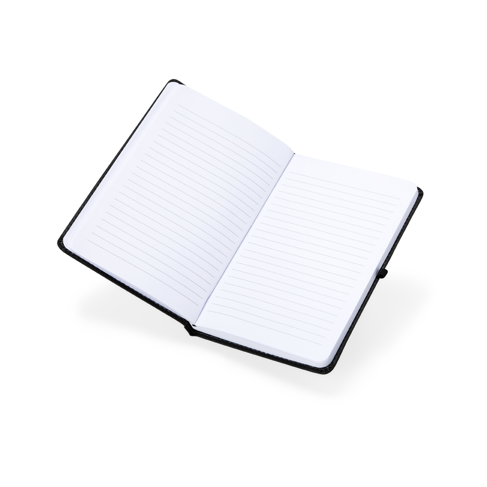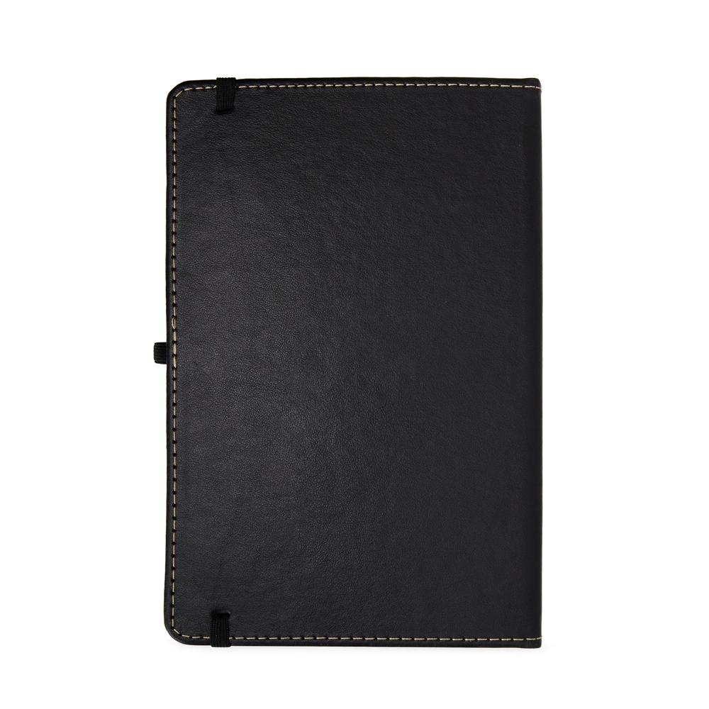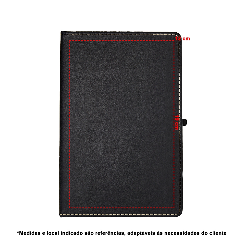 Descrição: Caderneta em couro sintético com porta caneta, marca página em cetim e elástico para fecho. Contém aproximadamente 80 folhas brancas com pauta.
