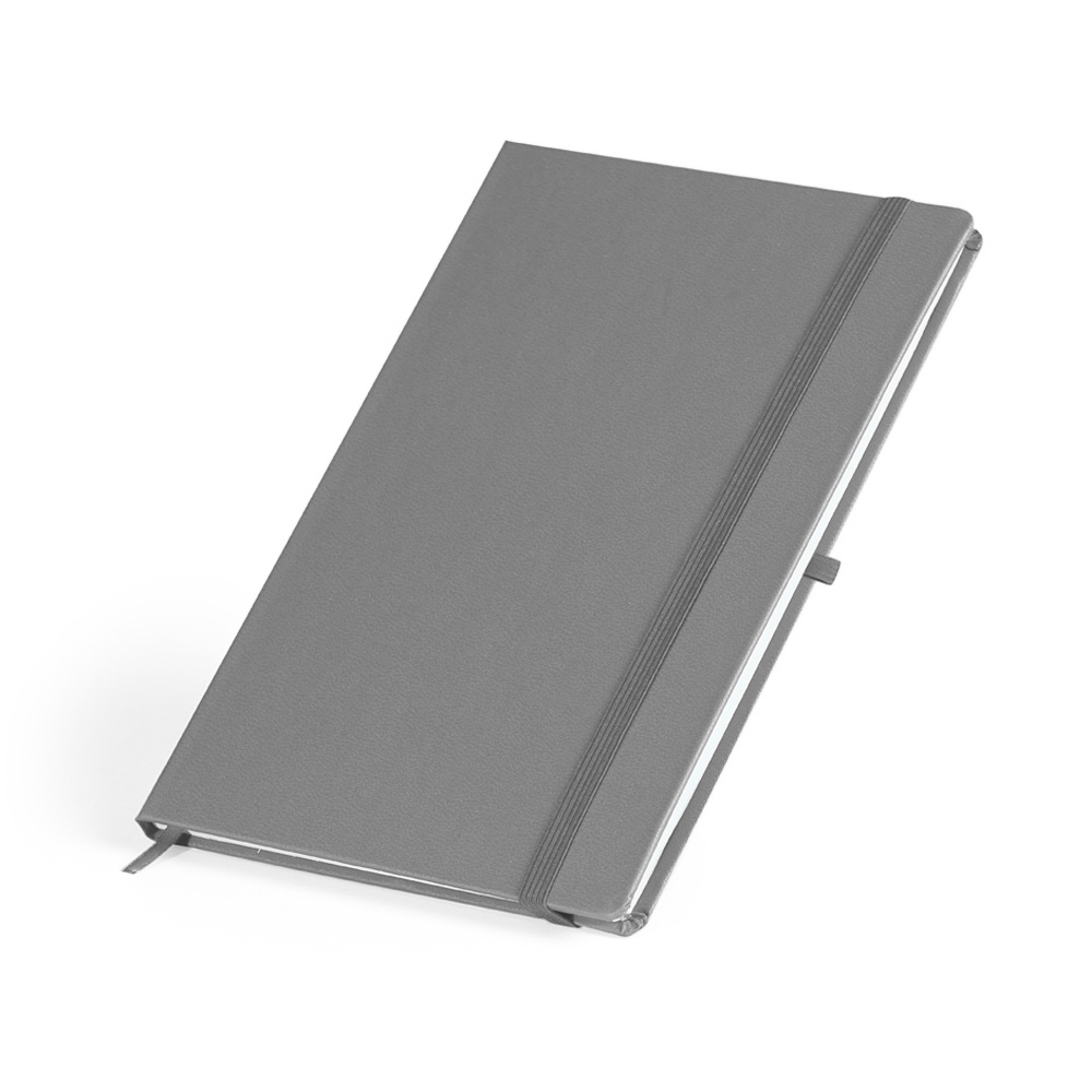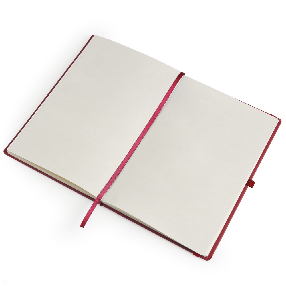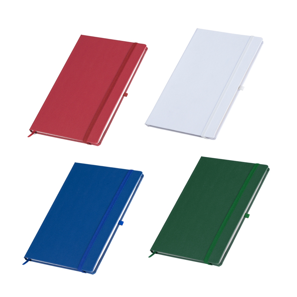 Descrição: Caderneta em percalux com marcador de página em cetim e fita elástica para fechar. Contém aproximadamente 80 folhas sem pauta.