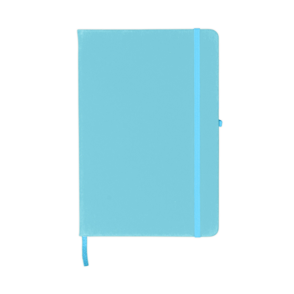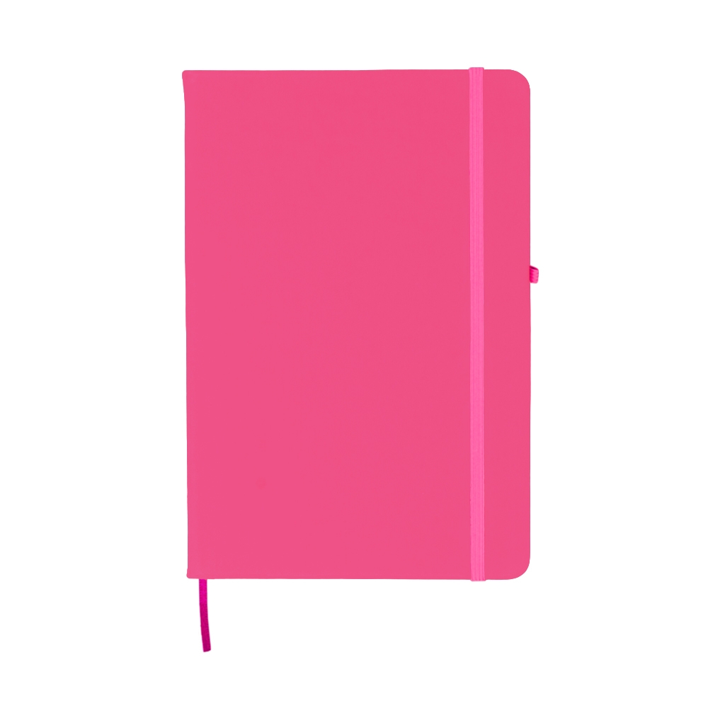 Descrição: Caderneta emborrachada com porta caneta elástico em nylon, marcador de página em cetim e fita elástica de nylon para fechar. Contém aproximadamente 80 folhas pardas pautadas.