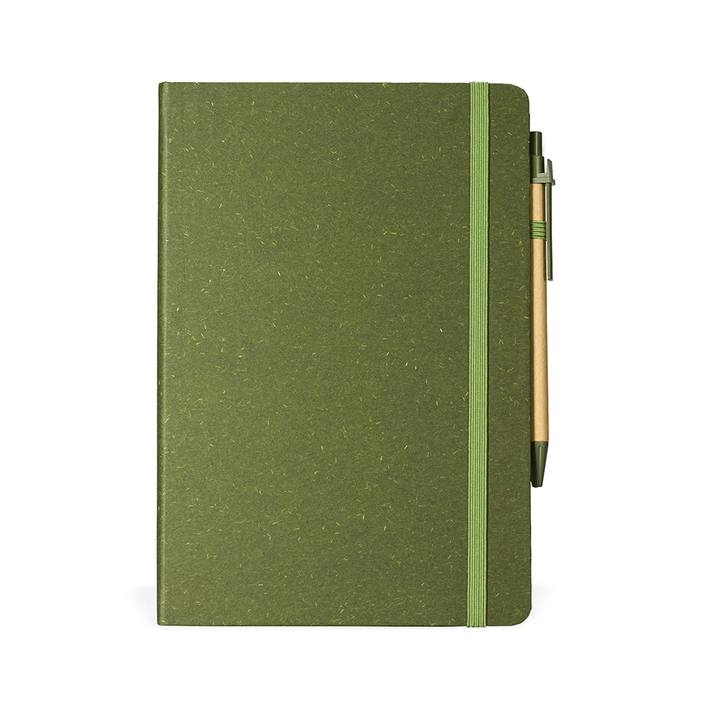 Descrição: Caderneta ecológica com capa em fibra da palha de arroz. Contém aproximadamente 80 folhas amareladas com pauta, além de duas folhas de guarda, uma fita elástica para fechamento e porta-canetas em elástico. Acompanha uma caneta esferográfica de carga azul de 1,0mm com corpo em papelão e clip, acionamento por clique e ponteira em plástico.