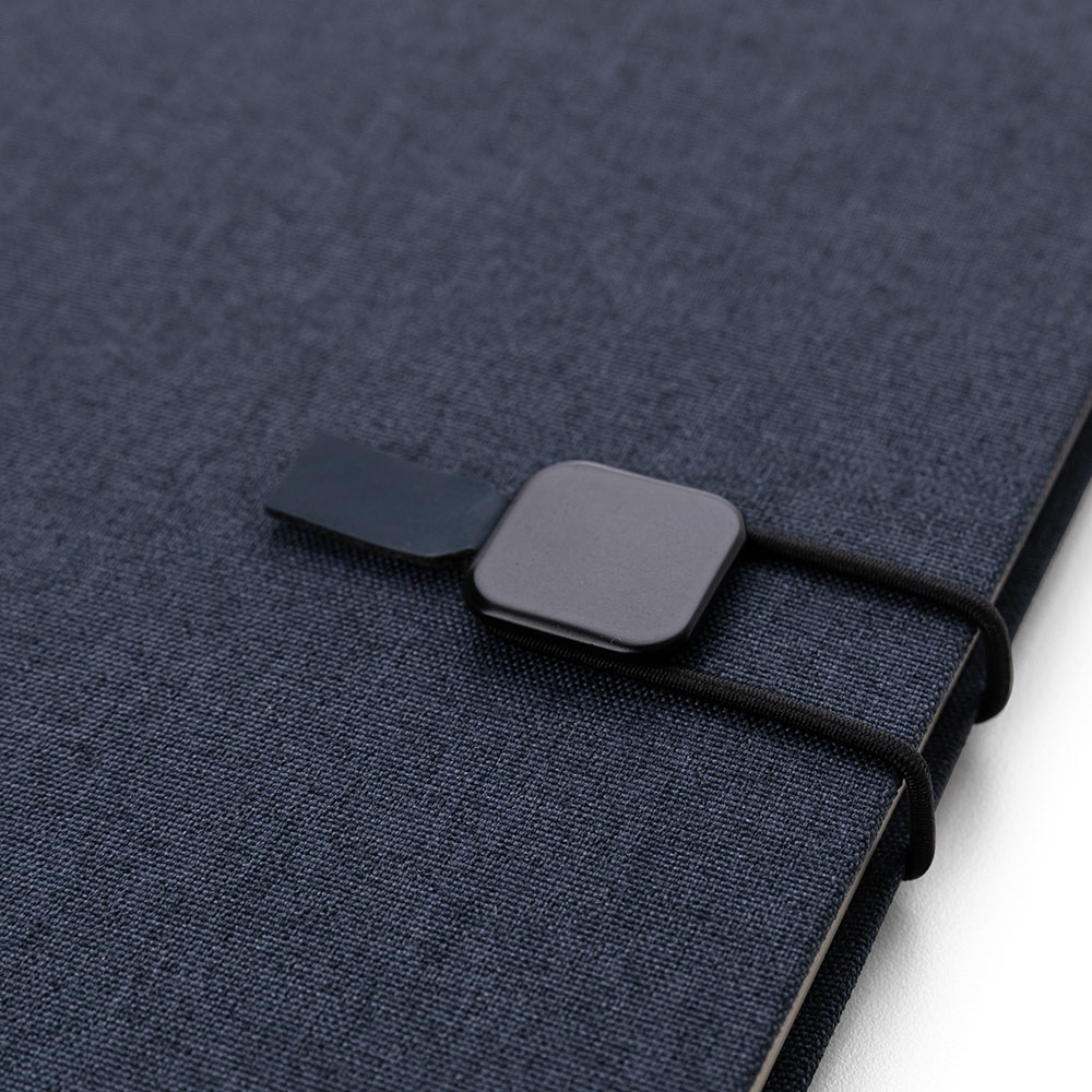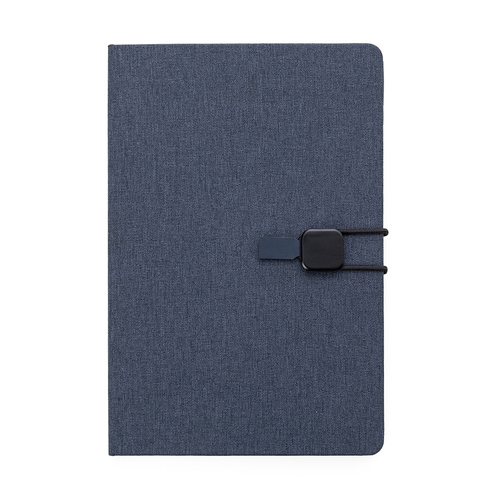 Descrição: Caderneta capa dura em tecido de poliéster. Miolo com 80 folhas pautadas na cor bege. Possui elástico lateral com detalhe em couro sintético para fechamento do caderno.