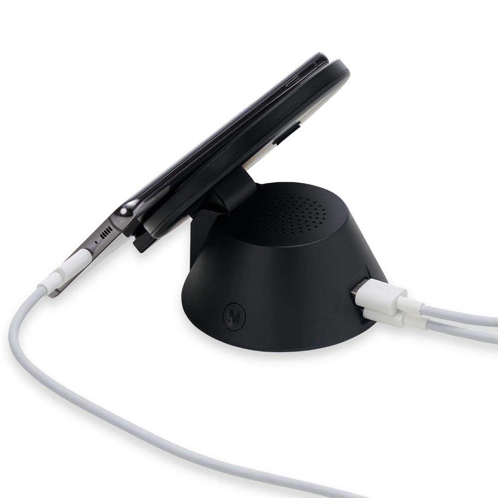 OBS.: Funciona exclusivamente conectado a uma fonte de energia, tanto a caixa de som quanto o carregador via indução. Não possui bateria para armazenamento de carga.