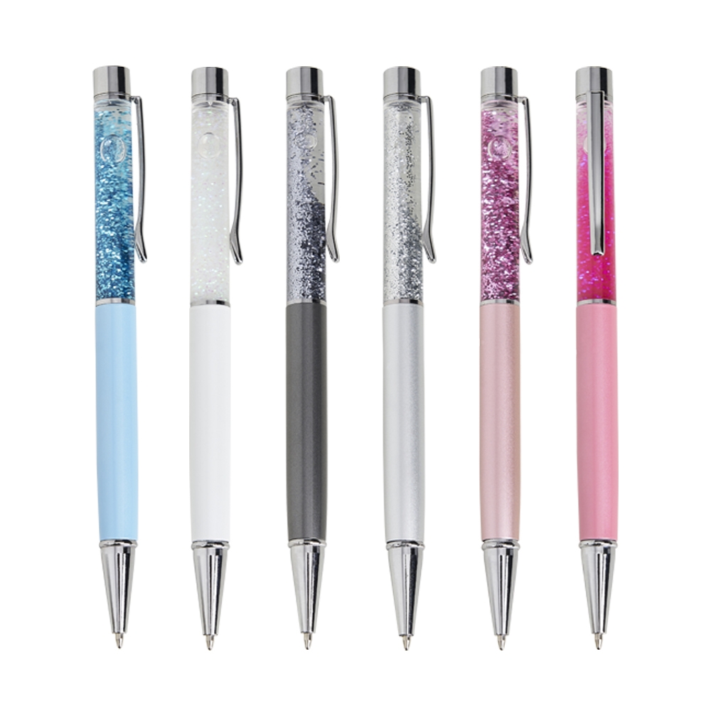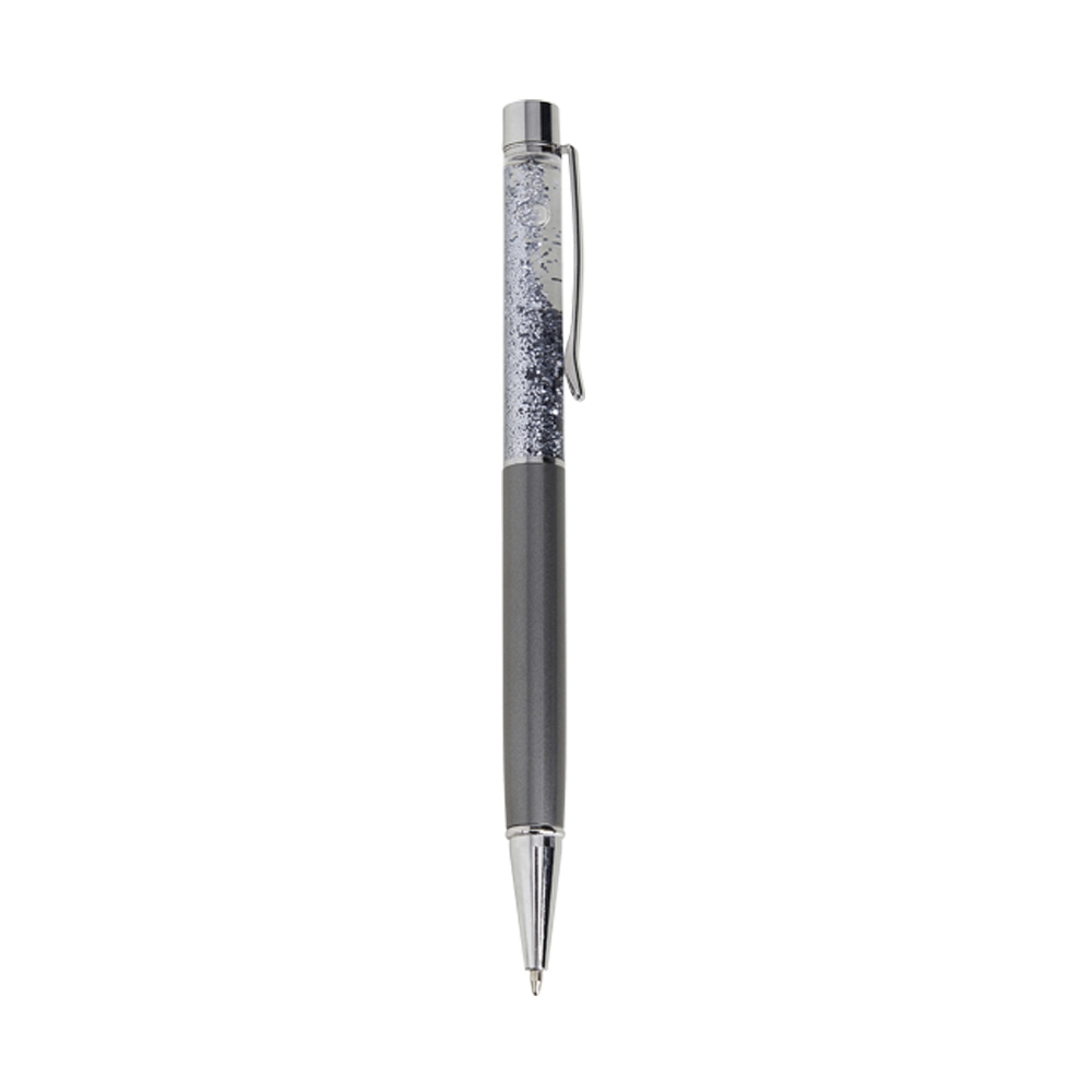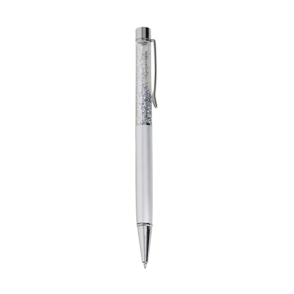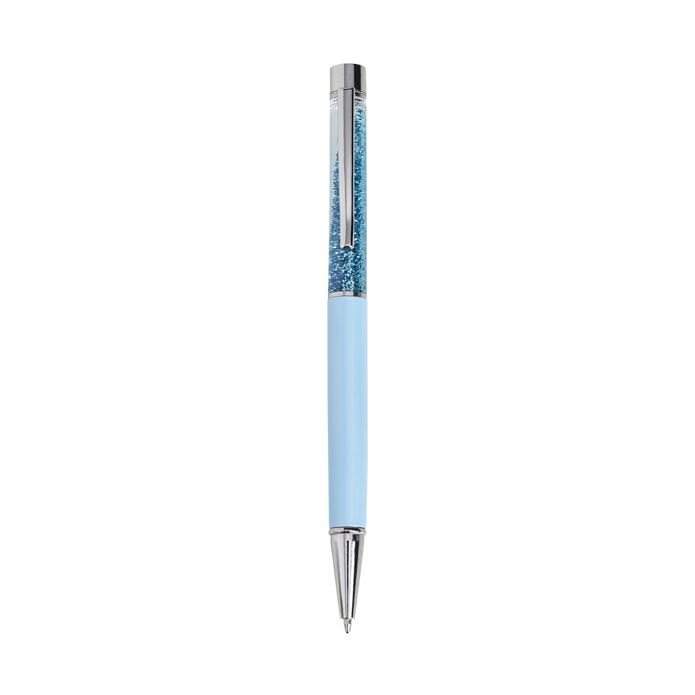 Descrição: Caneta metálica com glitter, acionamento por rotação e carga esferográfica 1.0mm azul.