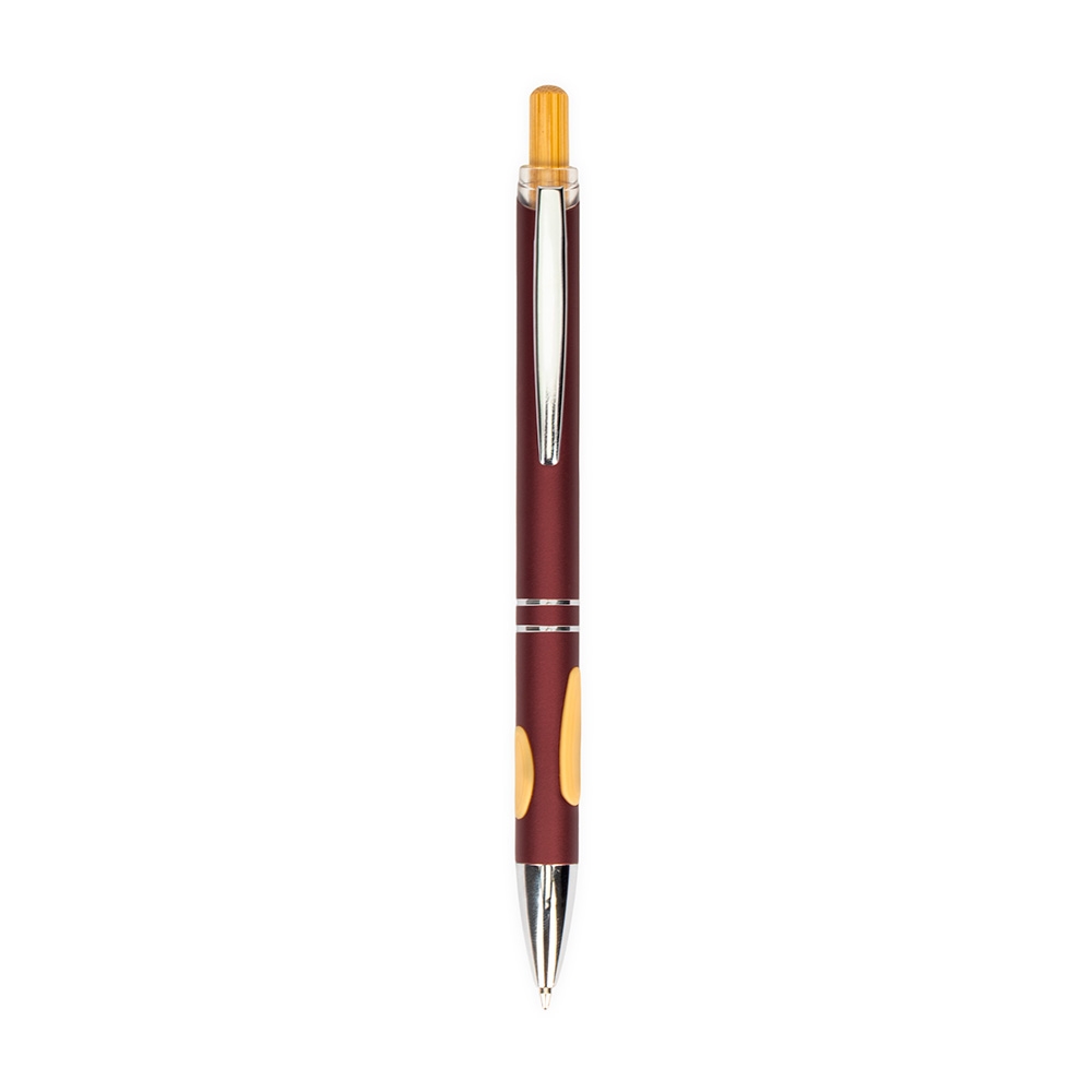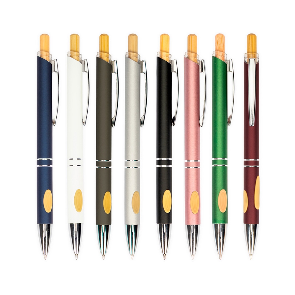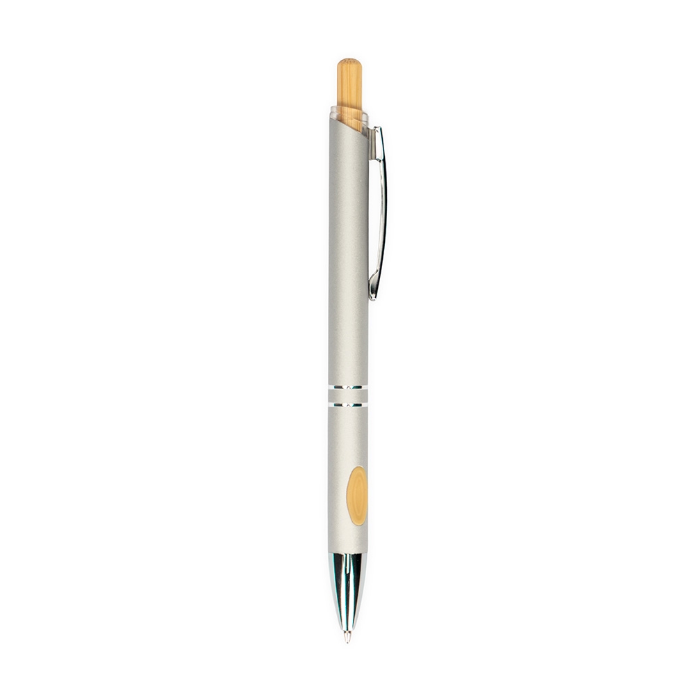 Descrição: Caneta metálica com detalhes emborrachados no corpo, acionamento por clique com parte superior em bambu, carga esferográfica azul de 1.0mm, o que proporciona uma pegada leve e uma escrita precisa.