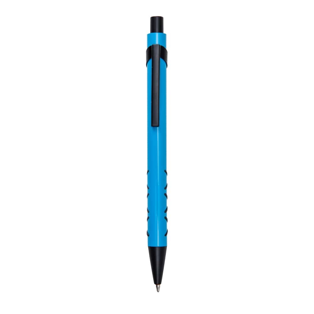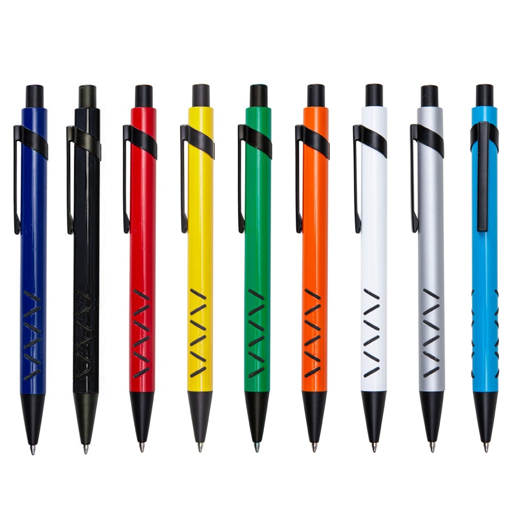 Descrição: Caneta metálica com detalhe emborrachado, carga esferográfica azul e acionamento por clique. OBS.: PEDIDO APENAS MÚLTIPLO DE 50 PEÇAS!
