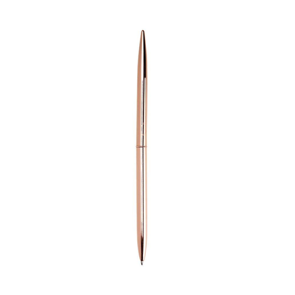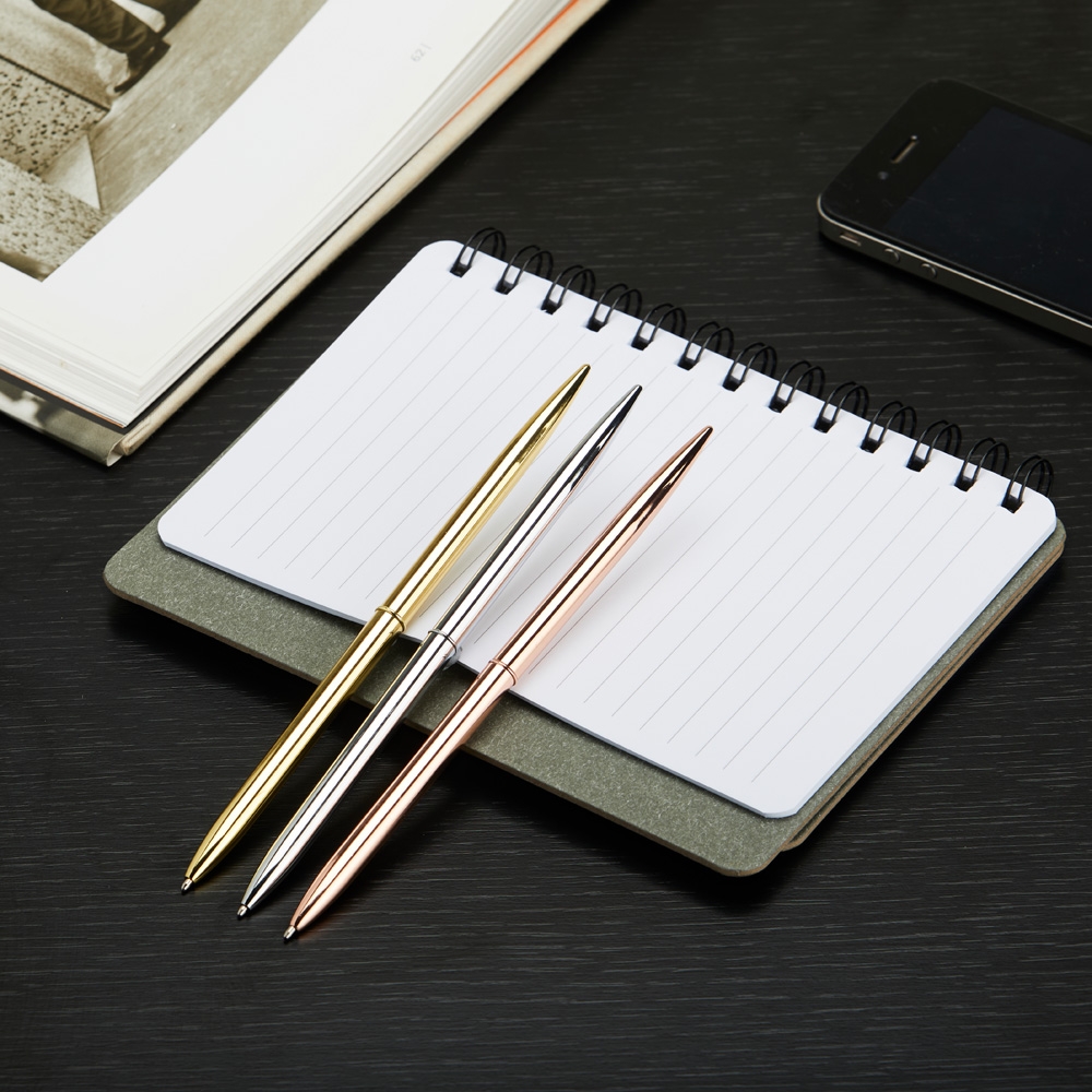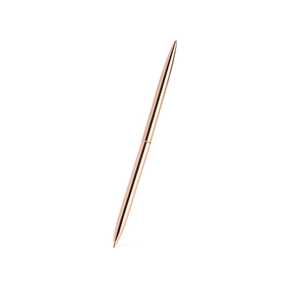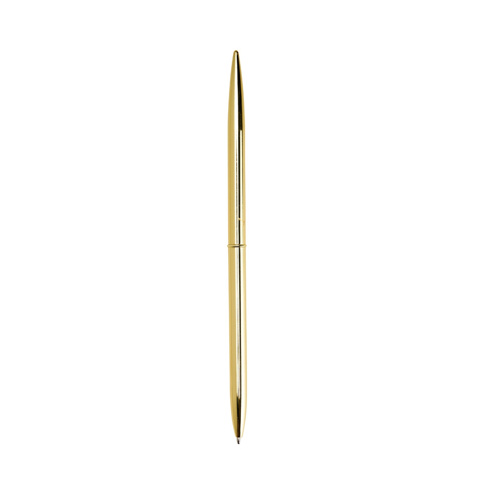 Descrição: Caneta metálica com acionamento por rotação e carga esferográfica azul 1mm.
