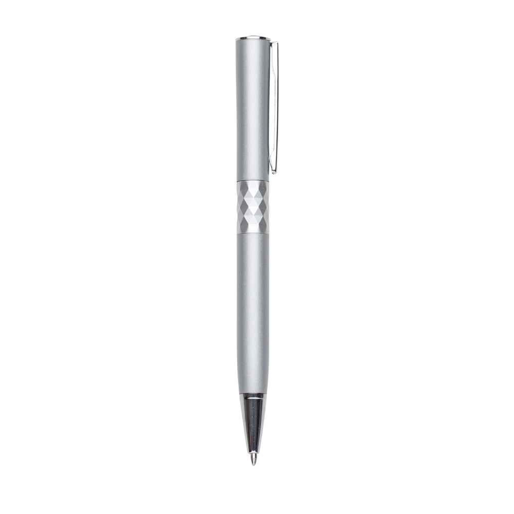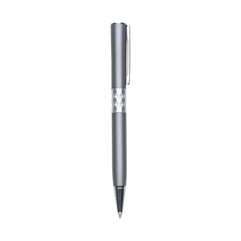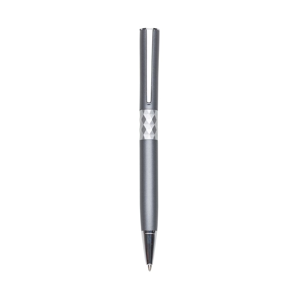 Descrição: Caneta metálica com carga esferográfica azul e acionamento por rotação. OBS.: PEDIDO APENAS MÚLTIPLO DE 50 PEÇAS!