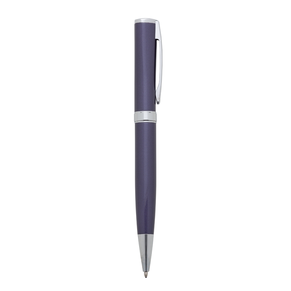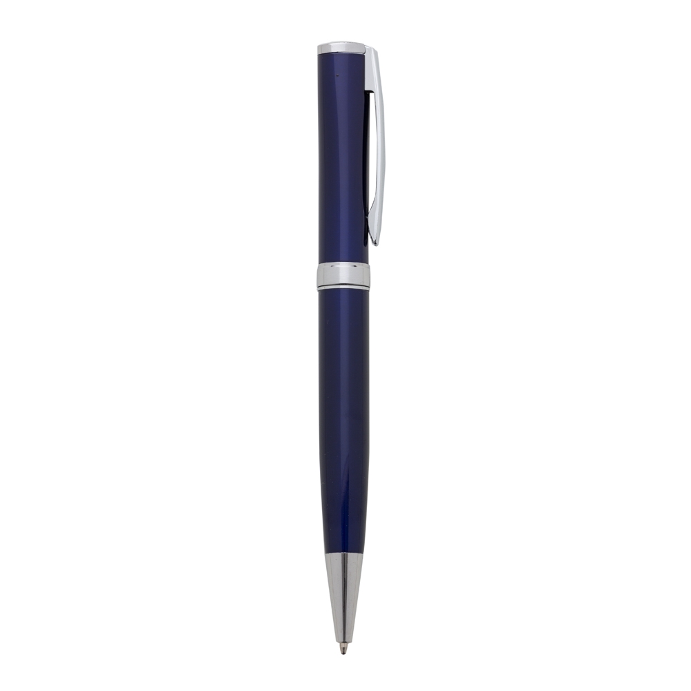 Descrição: Caneta metálica com carga esferográfica azul 1.0 mm e acionamento por rotação.