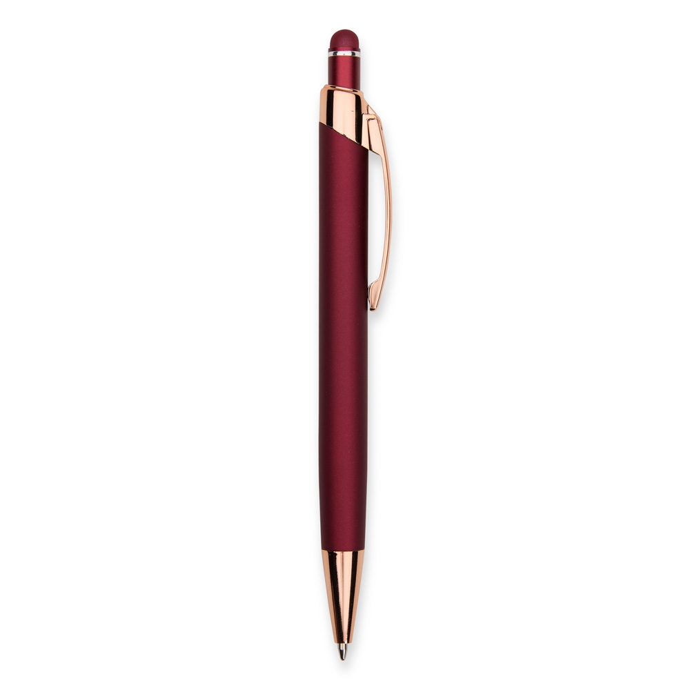 Descrição: Caneta metálica com carga esferográfica azul de 1,0mm e acionamento por clique de revestimento emborrachado para interação em dispositivos com telas sensíveis ao toque.