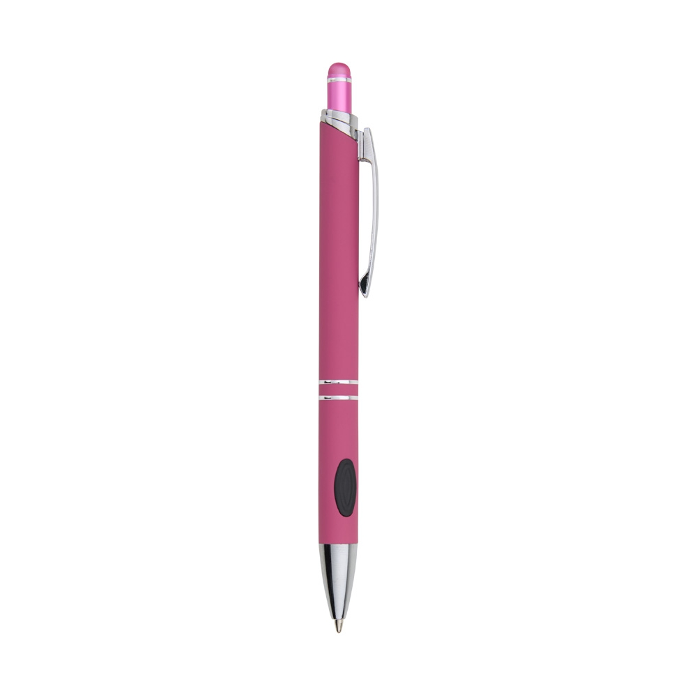 Descrição: Caneta metálica touchscreen com acabamento emborrachado, acionamento por clique e carga esferográfica azul 1.0mm.