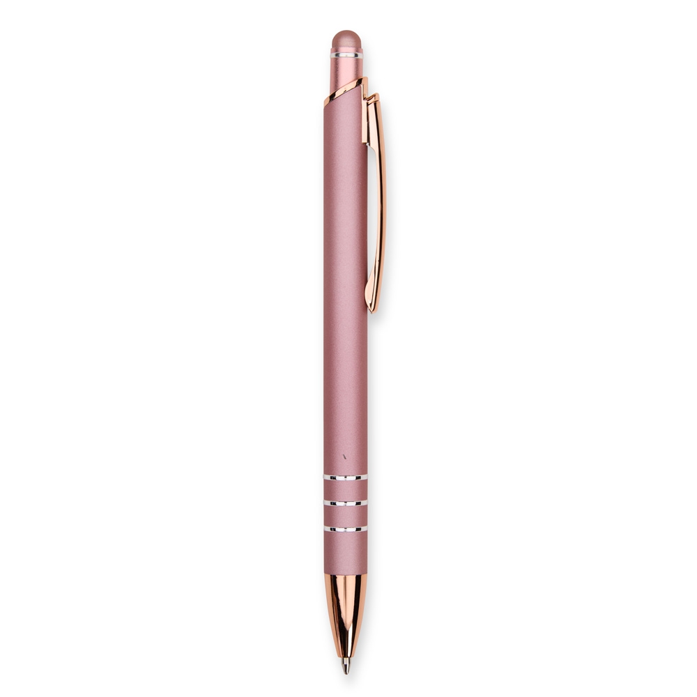 Descrição: Caneta metálica com carga esferográfica azul de 1,0mm e acionamento por clique com acabamento emborrachado para interação em dispositivos com tela sensível ao toque.