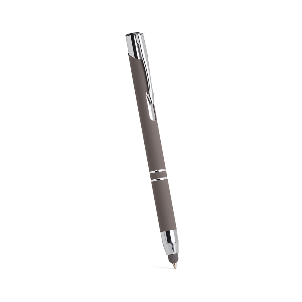 Descrição: Caneta esferográfica com carga azul de 1.0mm e acionamento por clique. De construção metálica, também possui ponteira emborrachada que permite seu uso como uma caneta touch para interação com dispositivos de tela sensível ao toque.