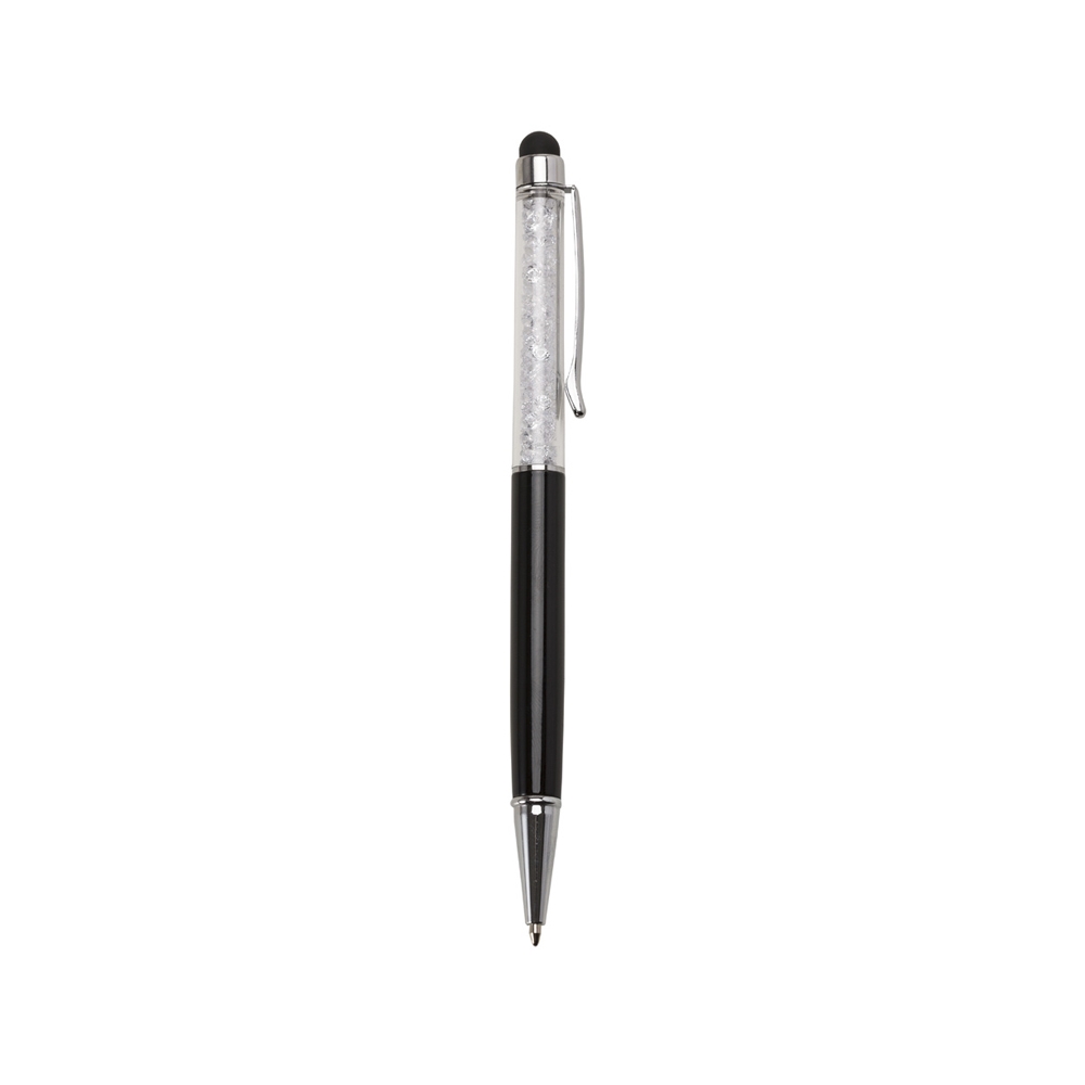 Descrição: Caneta metálica com touch screen e detalhes em cristal, carga esferográfica azul 1.0 mm e acionamento por rotação.
