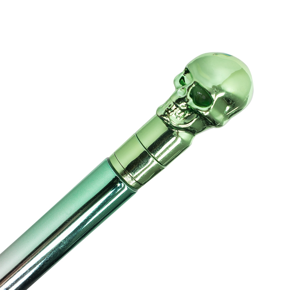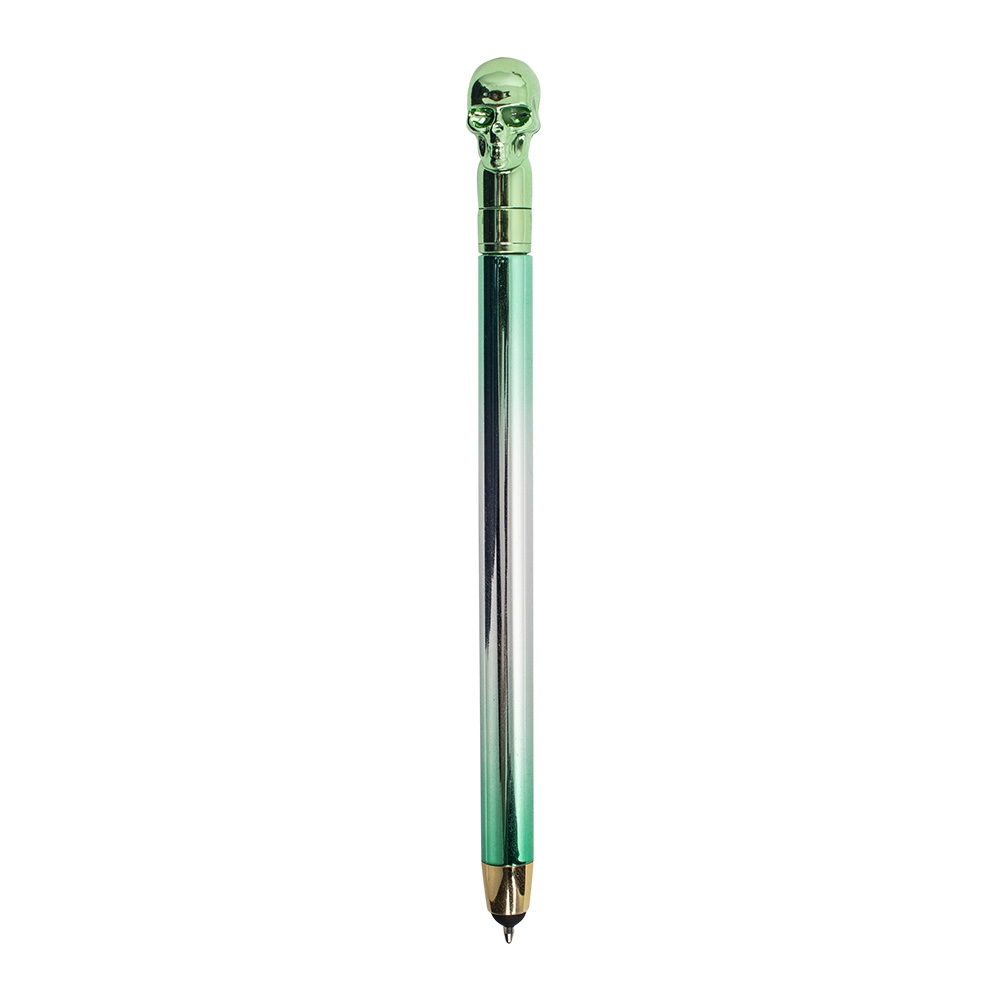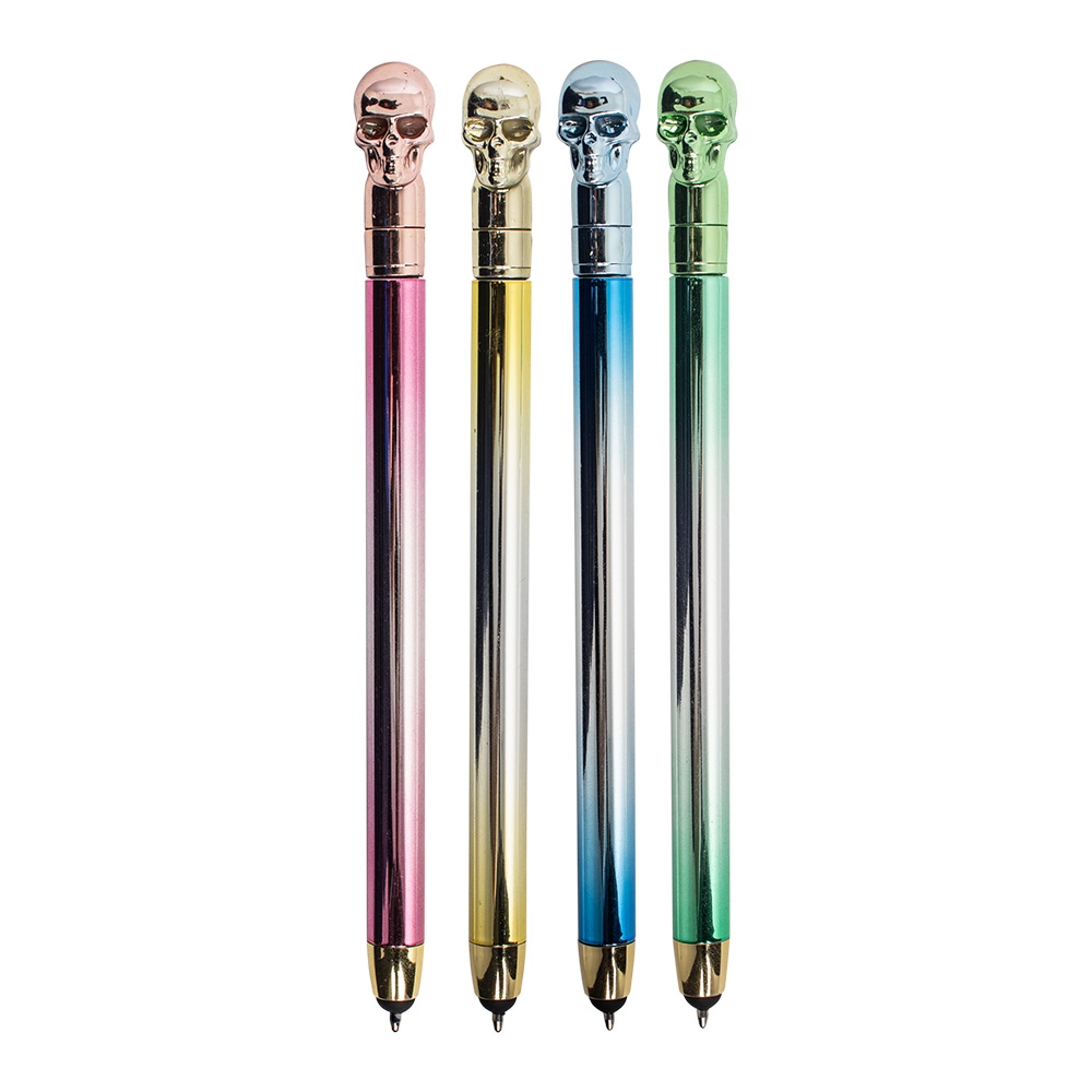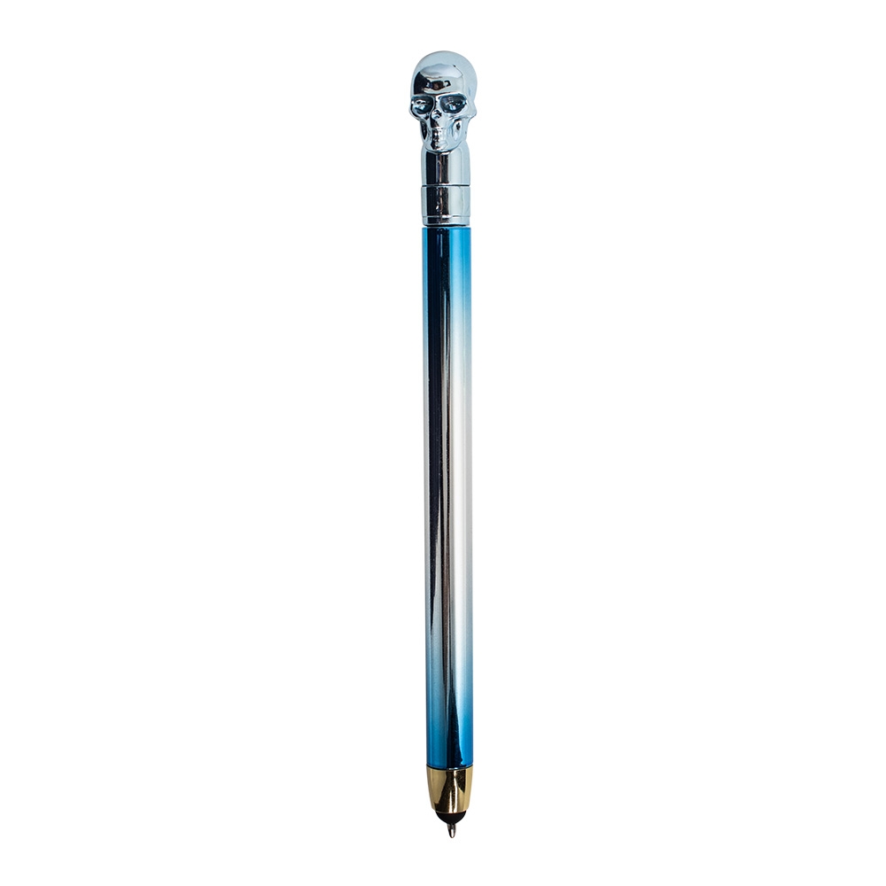 Descrição: O toque de ousadia que o seu cotidiano precisava está nesta caneta estilizada, decorada com uma caveira em cores vibrantes. Feita de plástico, acionamento por rotação que oferece praticidade, enquanto a carga esferográfica azul de 1mm proporciona uma escrita suave e precisa. Além disso, conta com a funcionalidade touchscreen, permitindo navegação em dispositivos móveis com facilidade. Perfeita para quem busca um acessório único, que combina estilo e versatilidade!