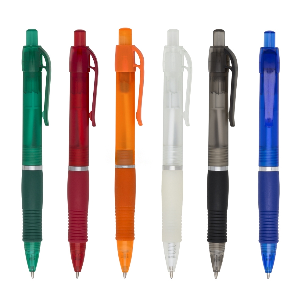Descrição: Caneta plástica com detalhe emborrachado, carga esferográfica azul 1.0 mm e acionamento por clique.