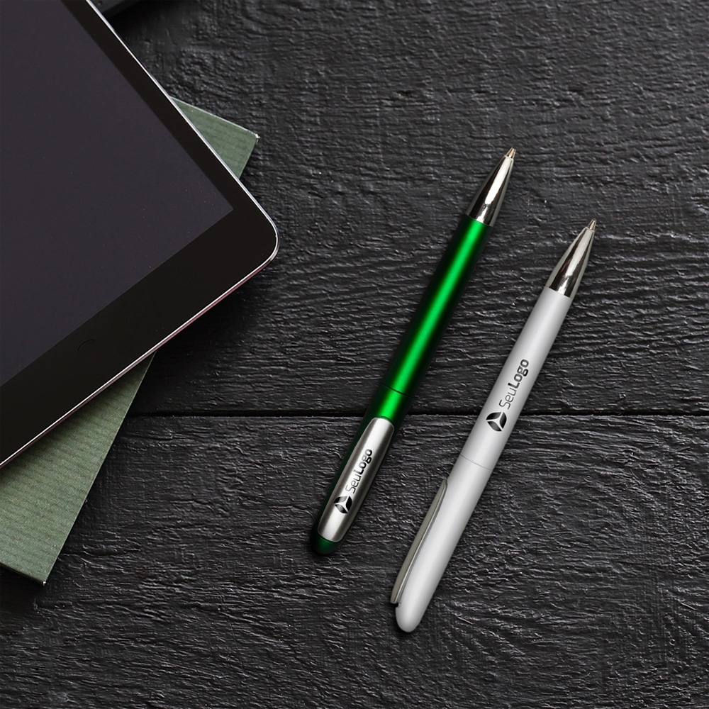 Descrição: Caneta plástica com carga esferográfica azul 1.0 mm e acionamento por clique no clipe.