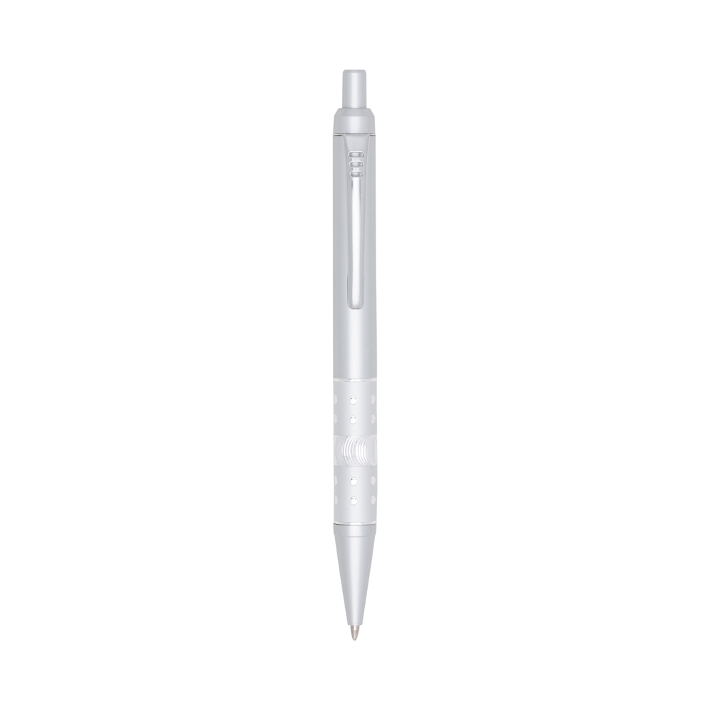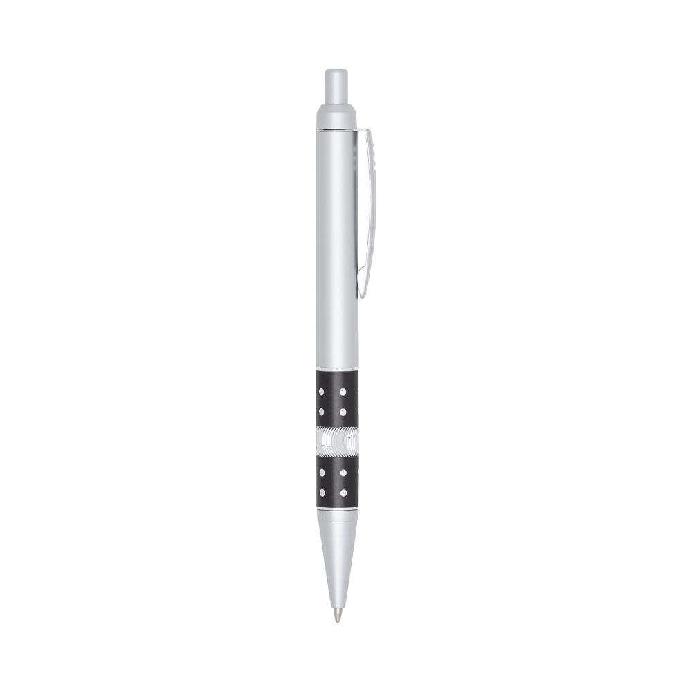 Descrição: Caneta plástica com detalhe strass, carga esferográfica azul 1.0 e acionamento por clique.
