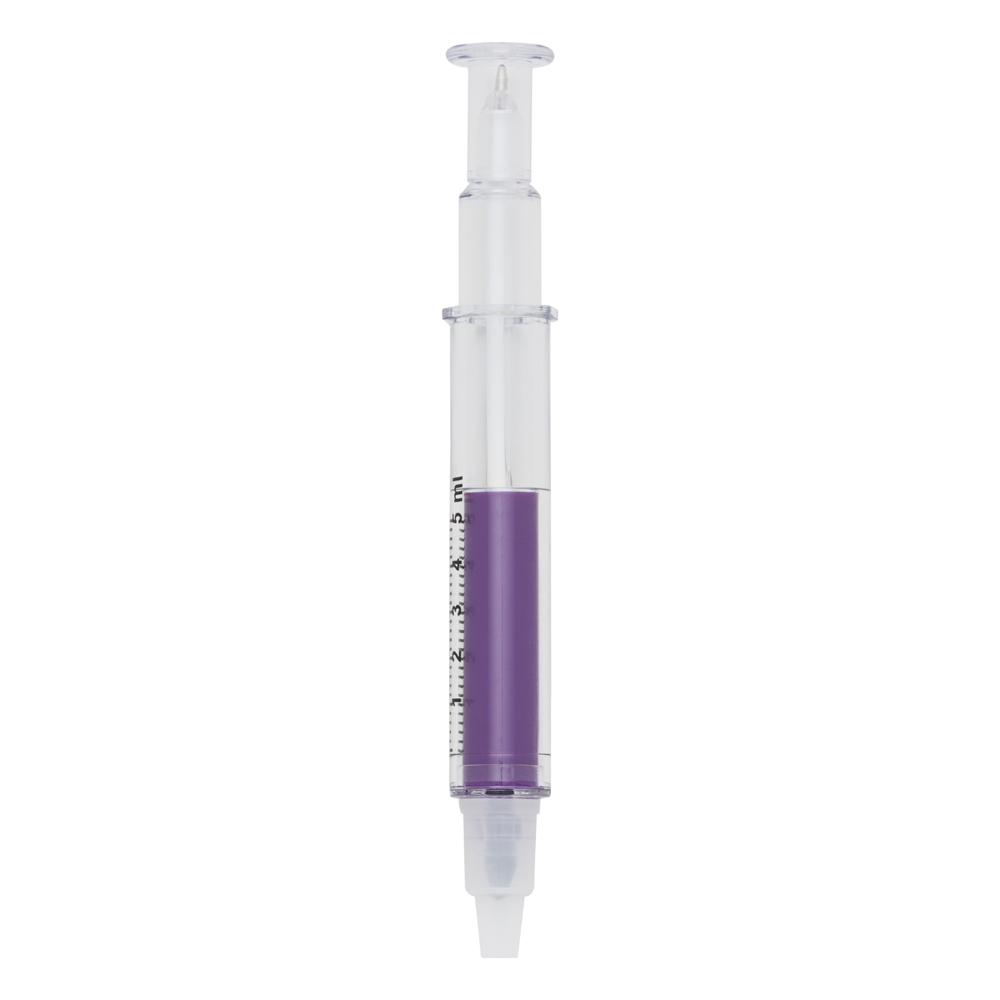 Descrição: Caneta plástica formato seringa, contém marca texto e carga esferográfica azul 1.0 mm, ambas com tampas protetoras.