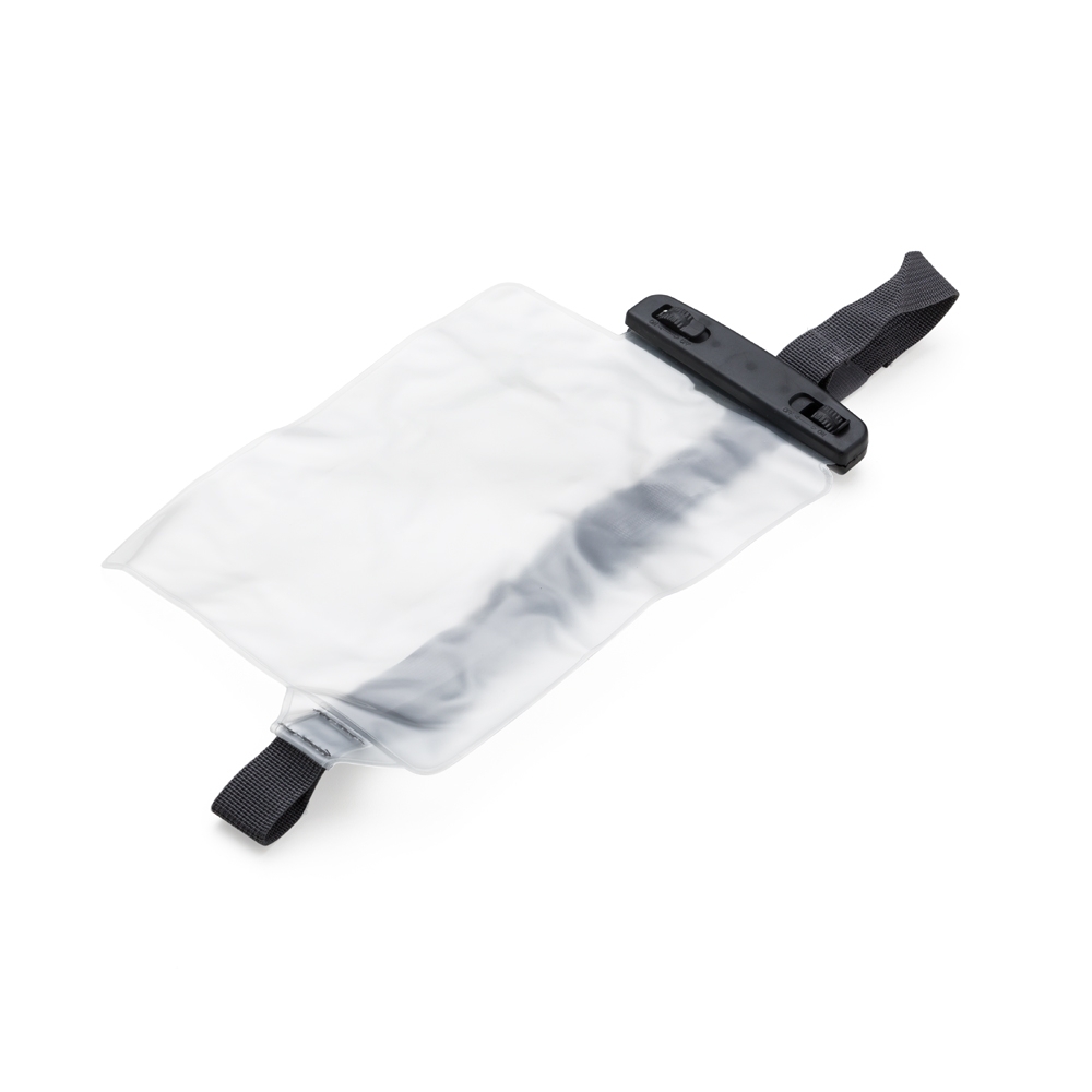 Descrição: Capa impermeável para itens diversos. Parte frontal transparente e verso fosco, suporte plástico preto com fivelas rotatórias(basta rotacioná-las para abrir o case). Possui alça de nylon ajustável com fivela plástica.