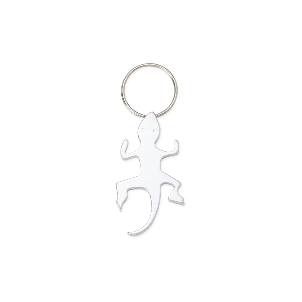 Descrição: Chaveiro abridor de garrafas metálico com formato de lagarto e argola de ferro niquelado.