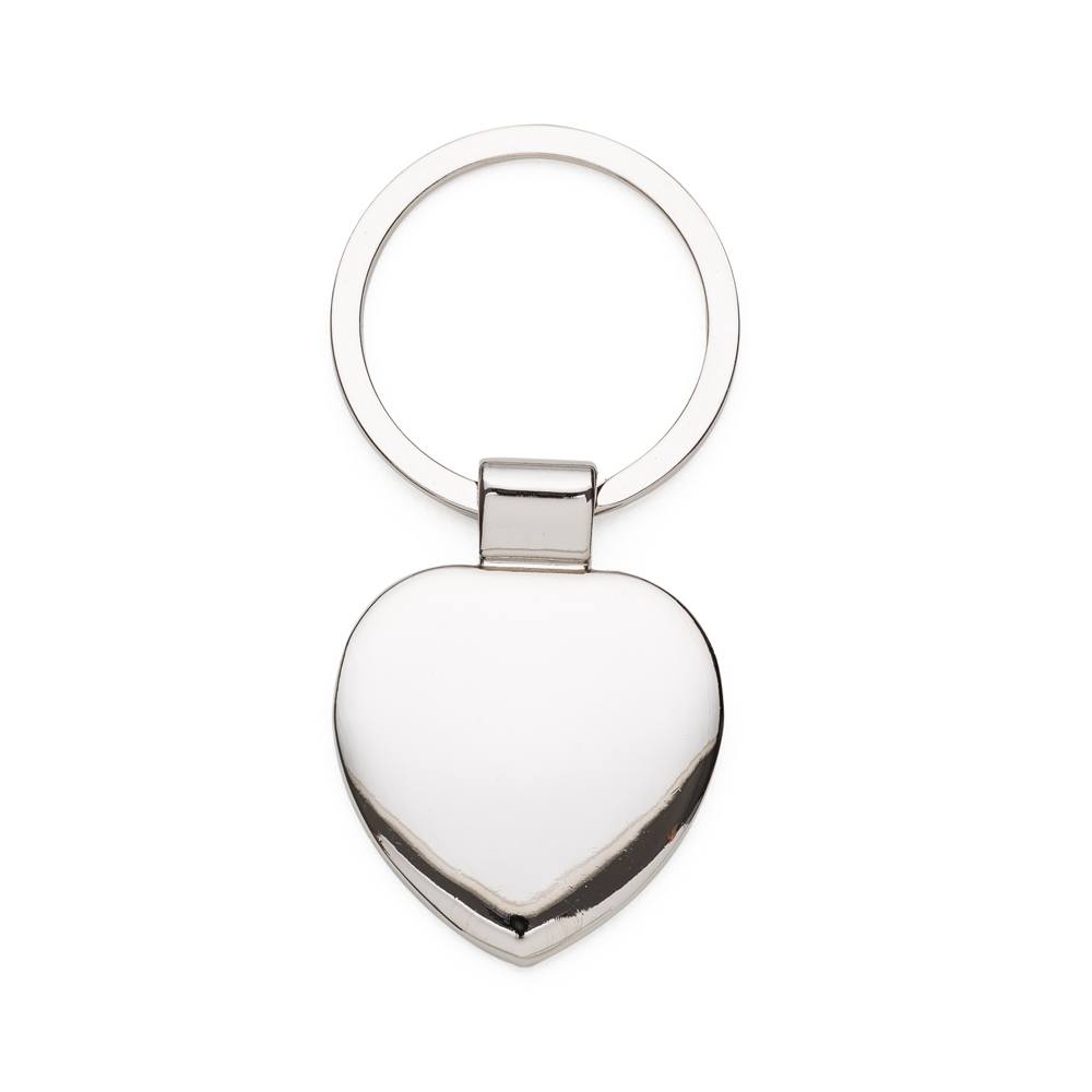 Descrição: Chaveiro de metal formato coração, possui chapa central em inox e verso brilhante liso.