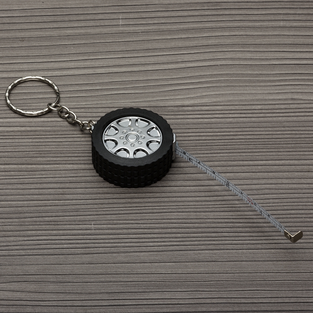 Descrição: Chaveiro plástico em formato de pneu de carro e argola metálica. Possui uma trena com fita de alcance máximo de 1 metro, além de exibir suas medidas em pés e polegadas.
