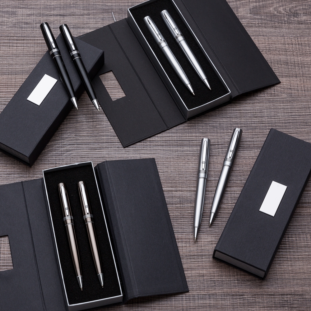 Medidas aproximadas para gravação (CxL): Caneta/Lapiseira 4,3 cm x 1 cm – Estojo 4,1 cm x 1,6 cm