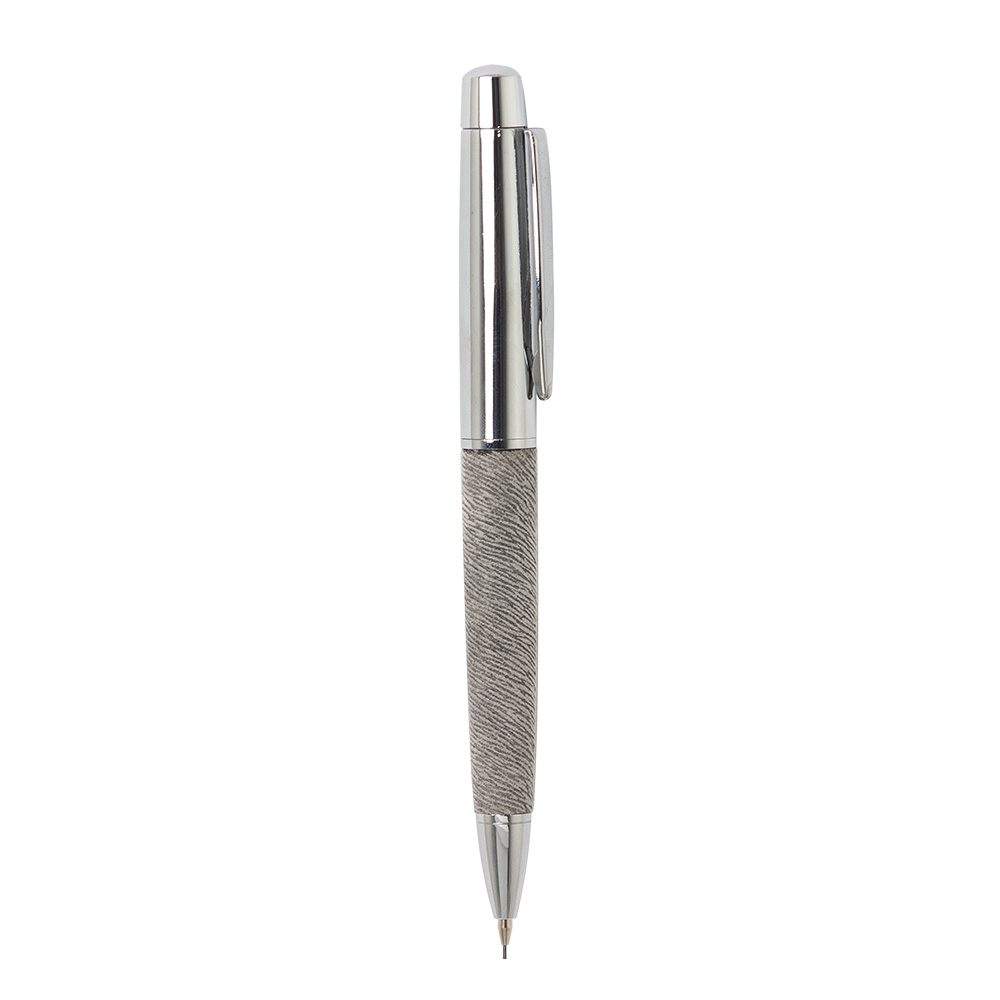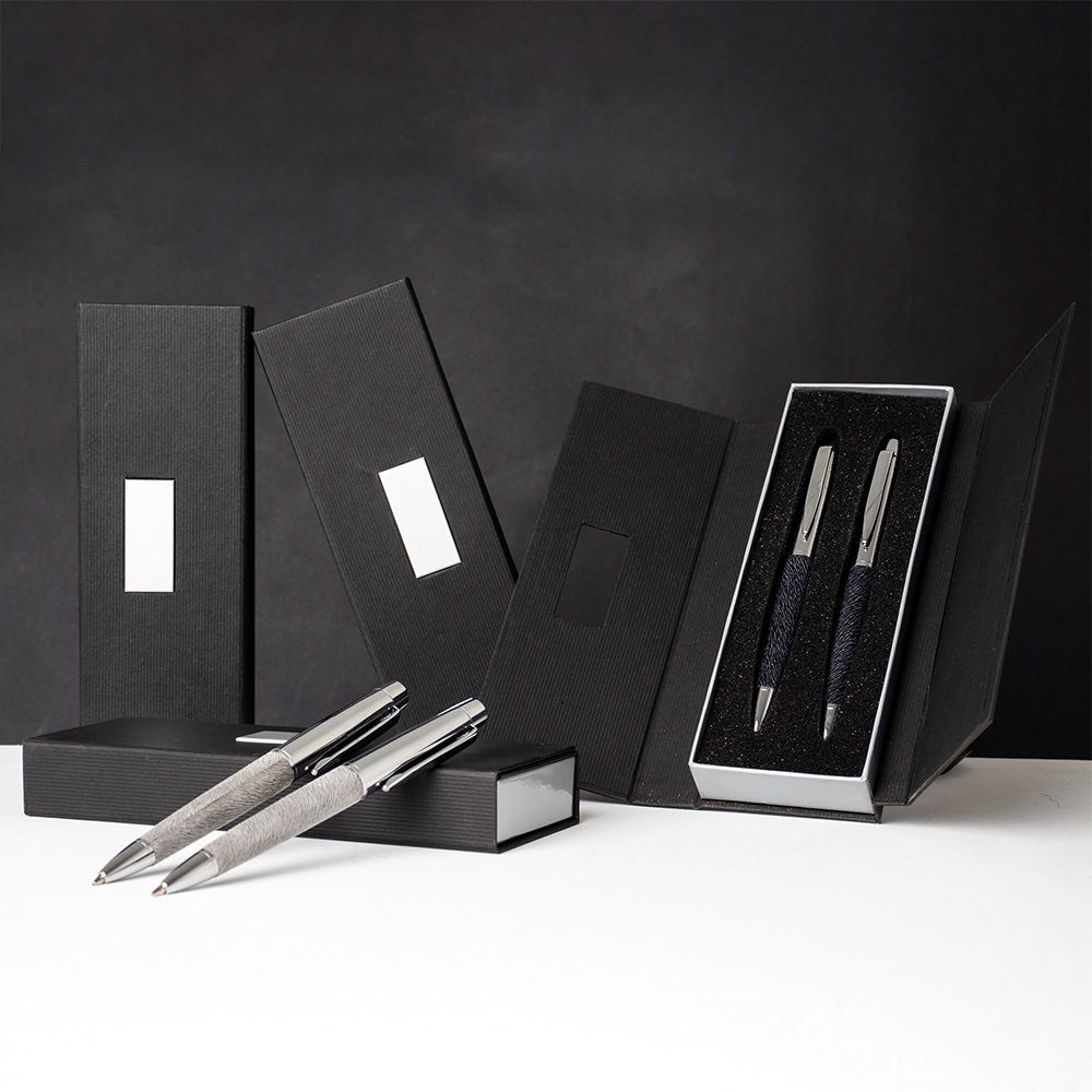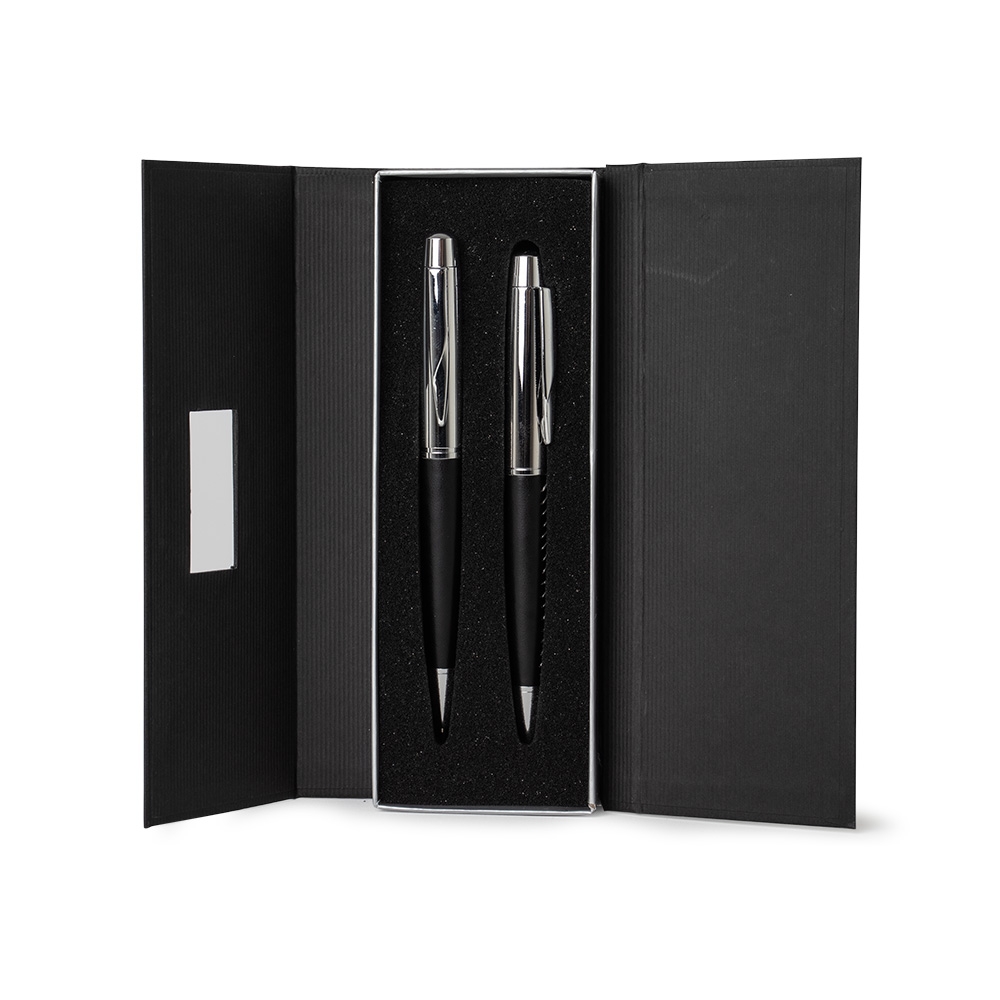 Descrição: Conjunto caneta e lapiseira em estojo de cartonagem com placa central para personalização. Caneta/Lapiseira metal prata com detalhes diferenciados na parte inferior, clip metal com detalhe de linha no centro. Acionam por giro. Estojo revestido com espuma na parte interna.