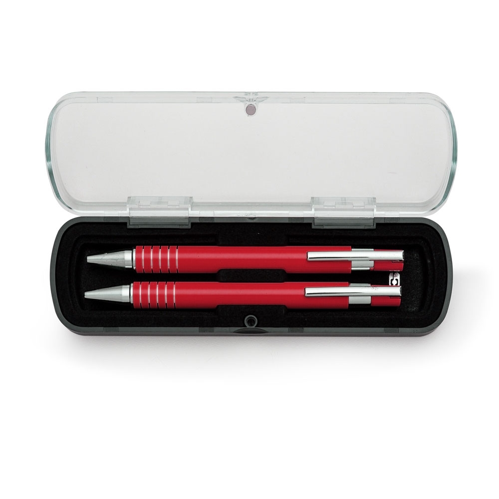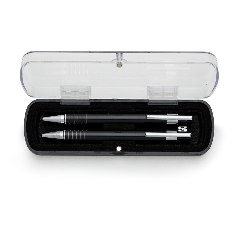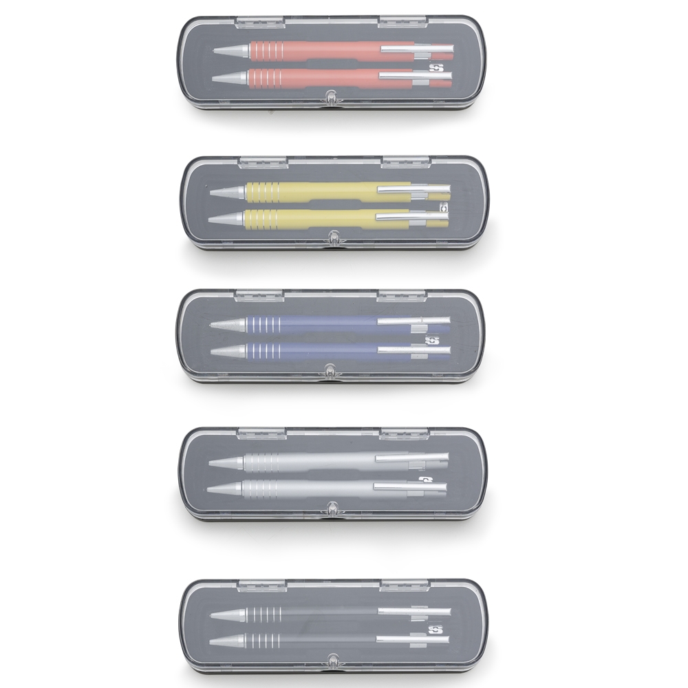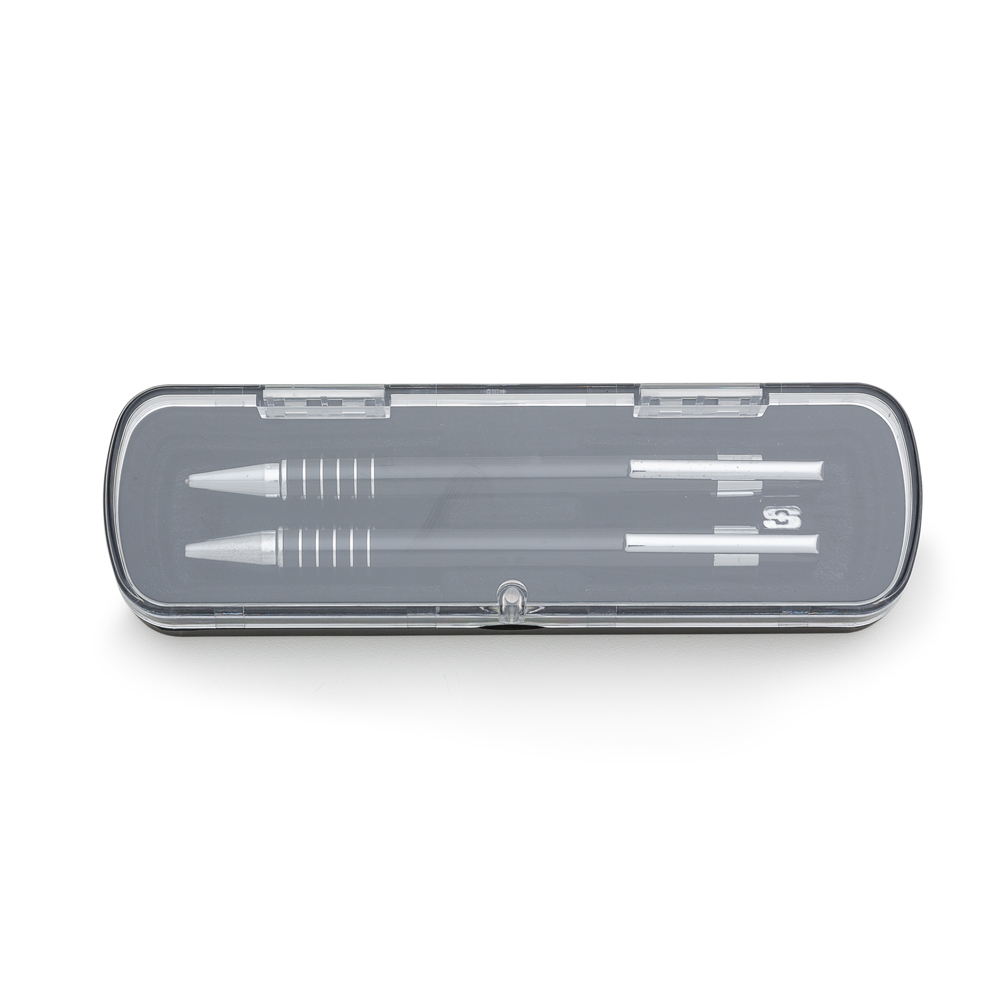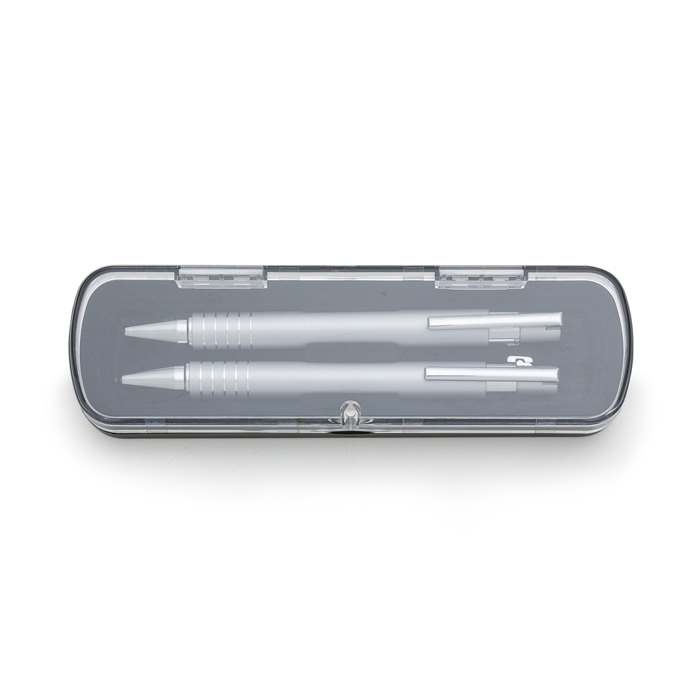 Descrição: Caneta e Lapiseira semimetal em estojo de acrílico com detalhe plástico. Caneta e lapiseira com clip de metal, suporte do acionador com anel plástico e cinco anéis prata na parte inferior, acionam por clique. Estojo revestido de veludo interno e com suporte/encaixe para fixar as peças dentro, estojo de imã. OBS.: PEDIDO APENAS MÚLTIPLO DE 50 PEÇAS!
