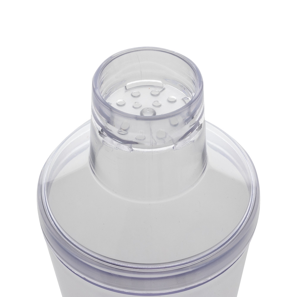 Descrição: Coqueteleira de acrílico com capacidade de 560ml, possui tampa de encaixe com peneira e um copo pequeno utilizado como tampa.