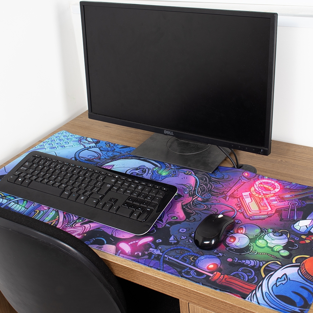 Descrição: Desk pad flexível confeccionado em poliéster. Apresenta design leve com bordas arredondadas e estampa de estilo futurista. Conta também com base antiderrapante em EVA que ajuda a proteger superfícies contra danos e desgastes.