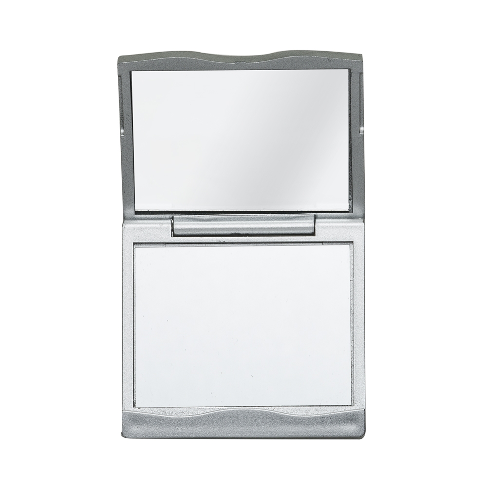 Descrição: Espelho duplo compacto com moldura em plástico, detalhe ondulado na área da abertura e tampa de formato curvo. Possui dois espelhos: o superior sem aumento e o inferior com aumento.