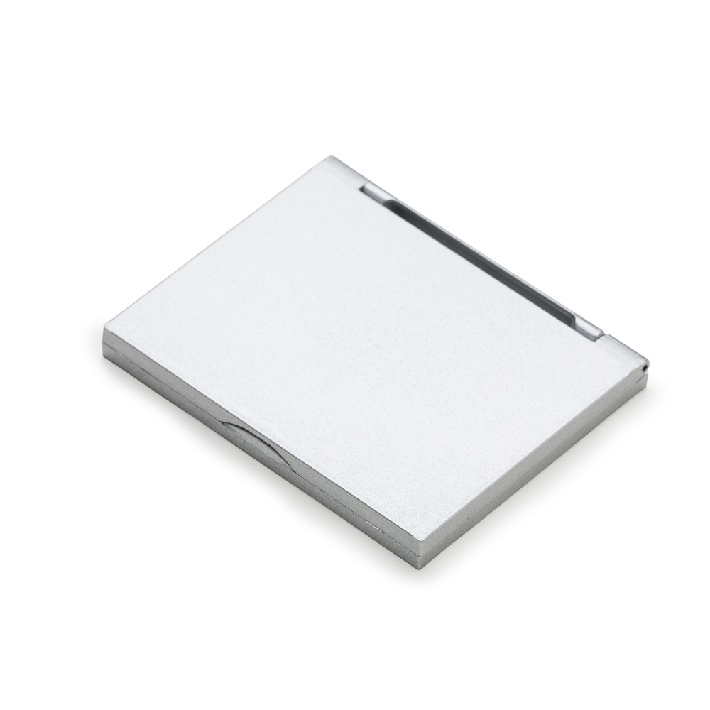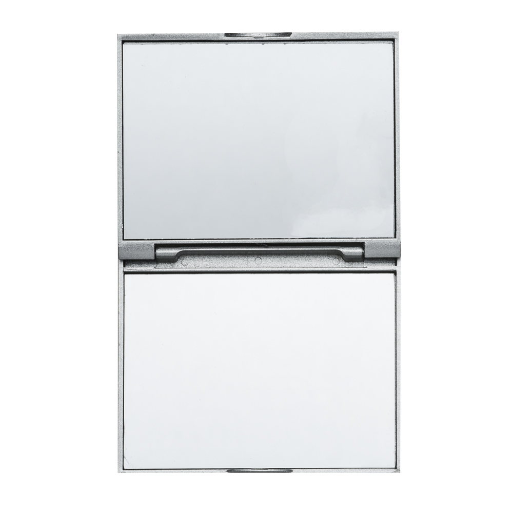 Descrição: Espelho retangular duplo sem aumento, material em plástico resistente com uma faixa na superfície e verso liso.