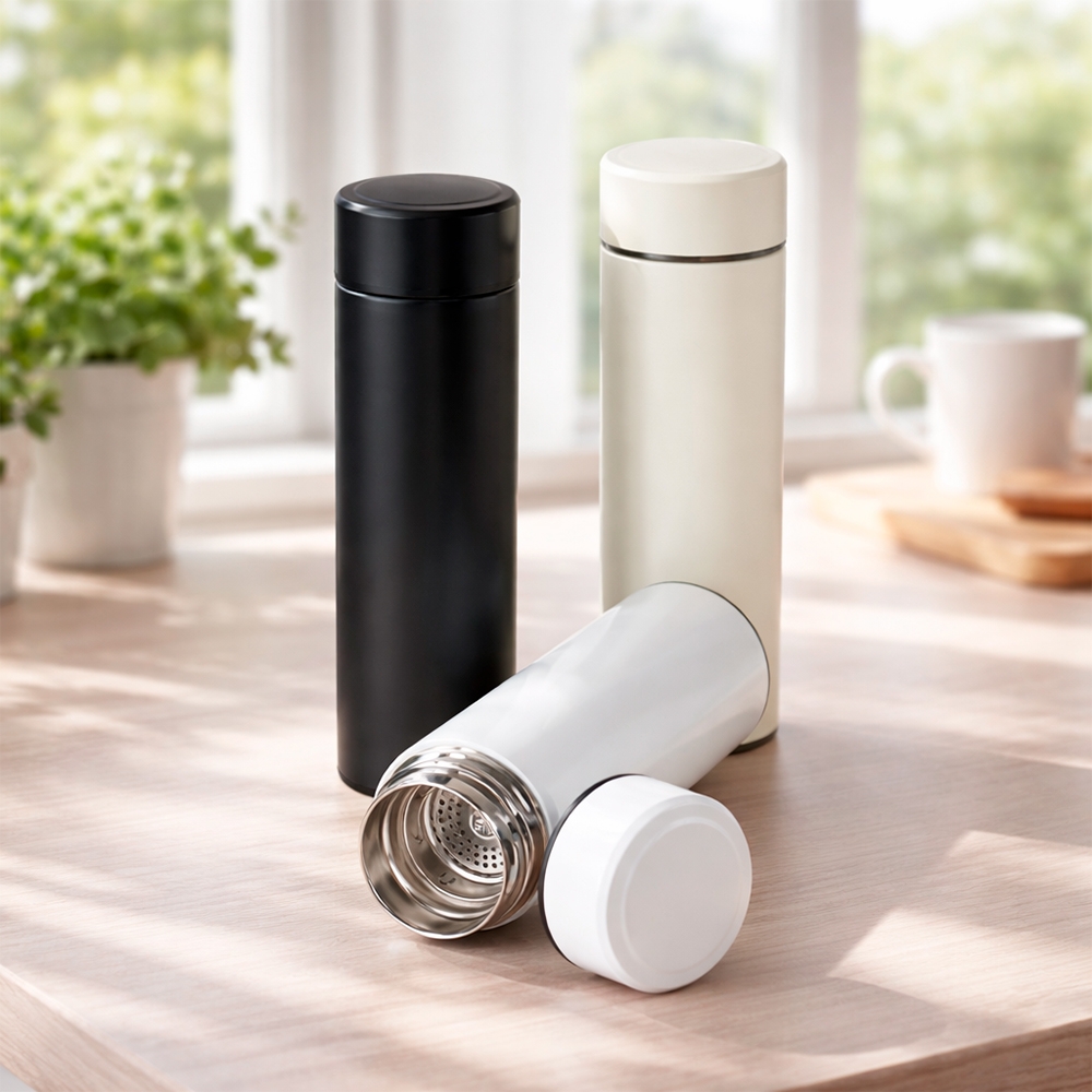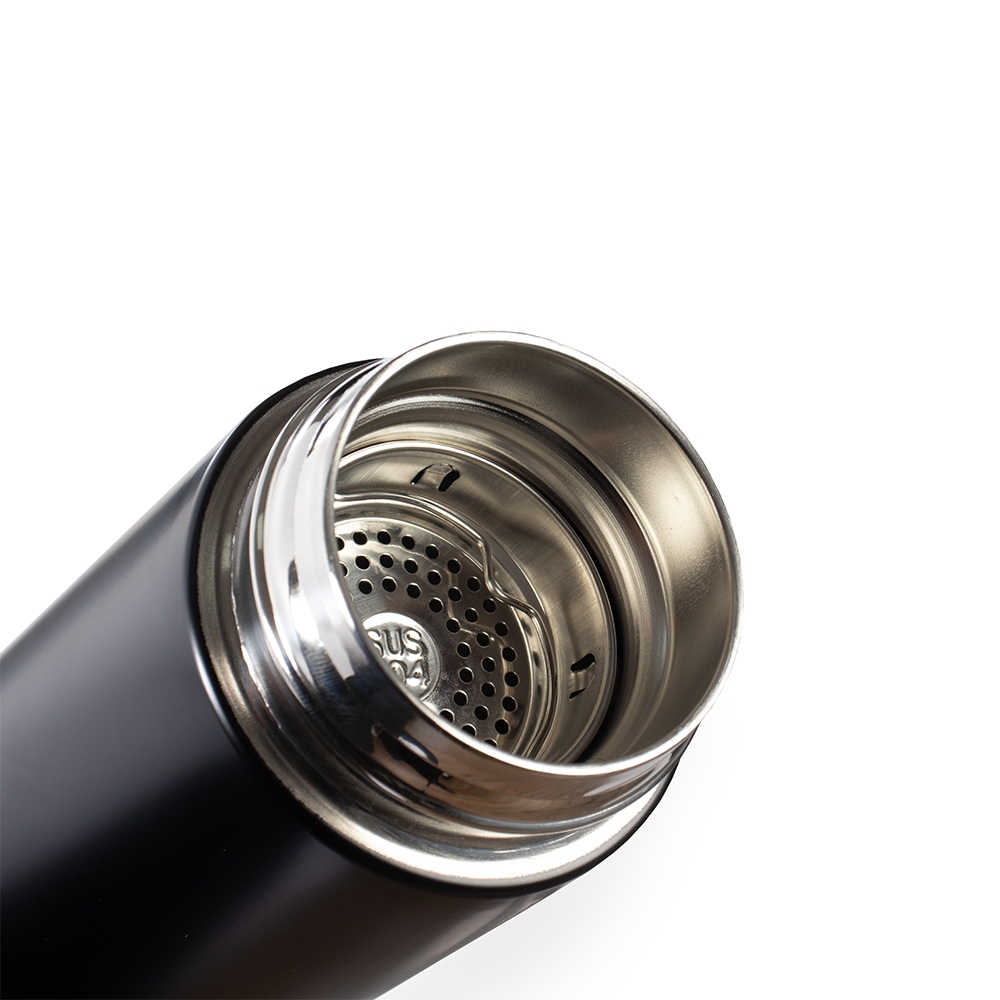 Descrição: Garrafa térmica de parede dupla, com parte externa em inox 201 e pintura aplicada por spray, e camada interna em inox 304. Possui capacidade de até 400ml, tampa rosqueável com parte interna em polipropileno (PP) e anel de vedação emborrachado, além de base antiderrapante em PP. Acompanha cesto infusor com alça em inox 304.