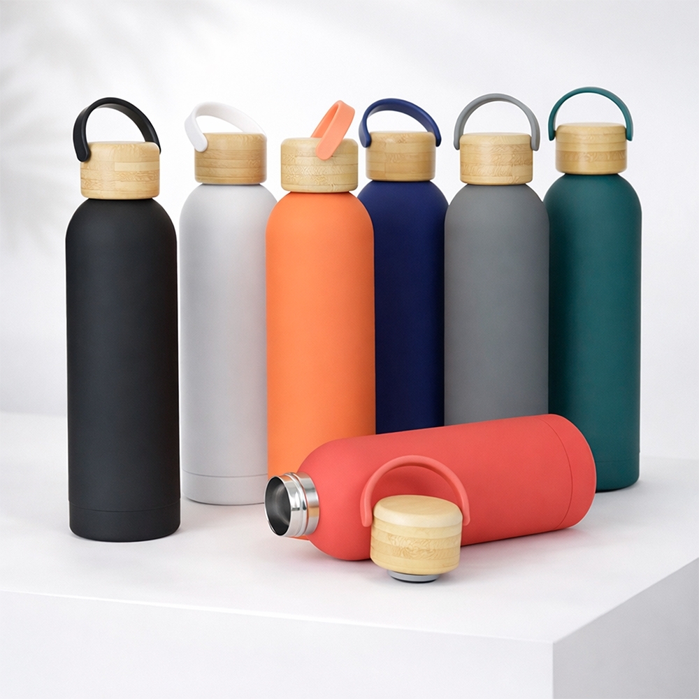Descrição: Garrafa térmica em inox com pintura emborrachada e capacidade para até 500ml. Possui estrutura de parede dupla e vedação a vácuo que permite conservar a temperatura de bebidas por mais tempo, além de tampa rosqueável em bambu com alça plástica para transporte.